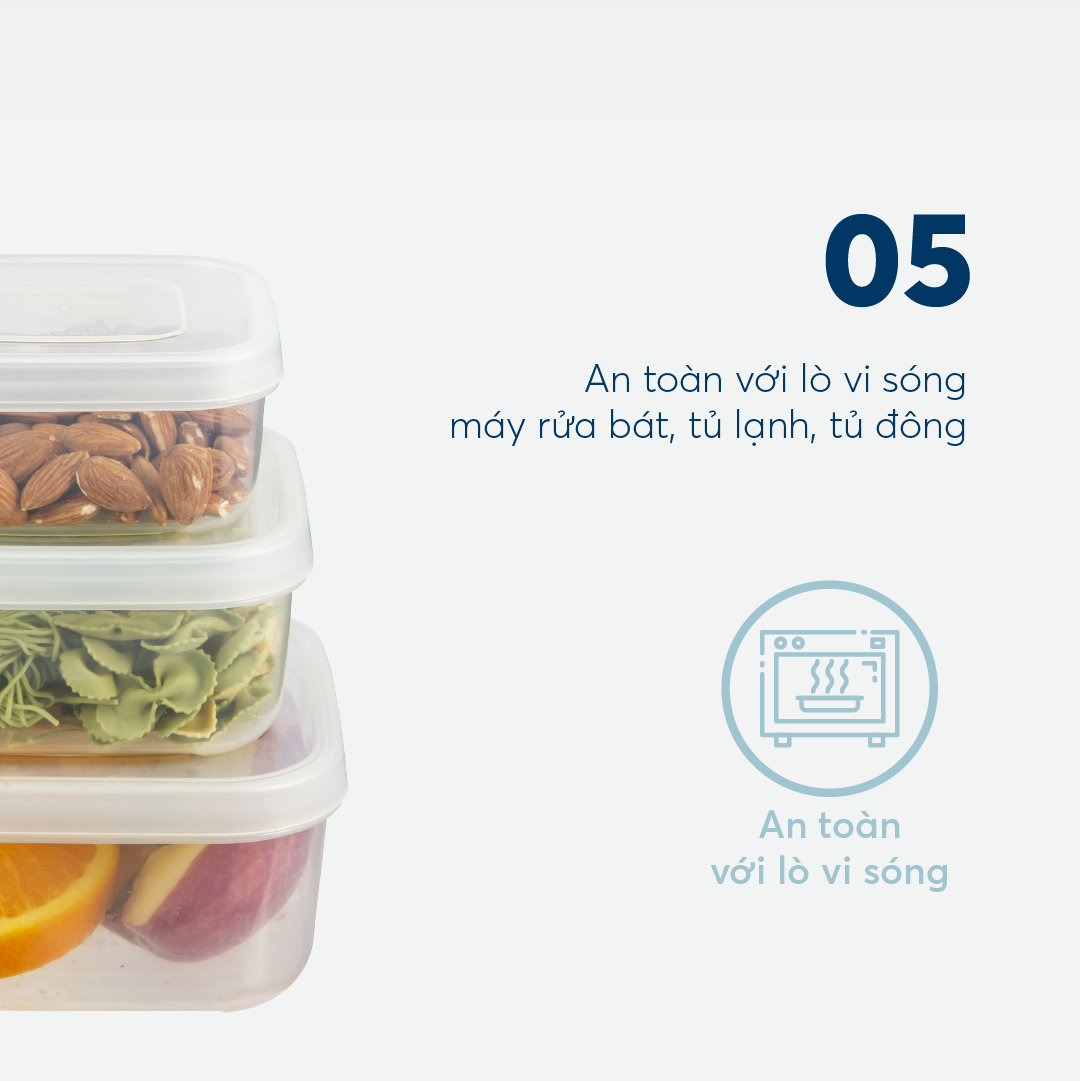 Bộ gồm 10 món dung tích lớn: • 2 hộp 300ml (1.3 cup) • 2 hộp 760ml (3.2 cup) • 1 hộp siêu lớn 2300ml (9.6 cup) ĐIỂM NỔI BẬT KHÔNG THỂ BỎ QUA Chất