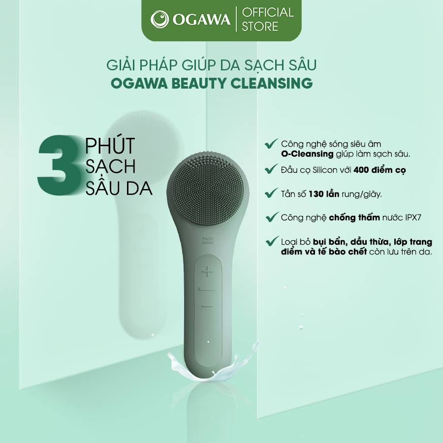 *** OGAWA Beauty Cleansing - Máy rửa mặt chuyên sâu với 400 điểm cọ silicon kết hợp cùng công nghệ sóng rung tâm suất cao 130 lần rung/giây, làm sạch sâu lỗ chân lông và vẫn dịu nhẹ với làn da. Tích hợp 6 mức cường độ, 2 chương trình làm sạch và massage da. Có chế độ nhiệt làm ấm sau 45s giúp giãn nở lỗ chân lông để lấy đi bụi bẩn sâu bên trong.