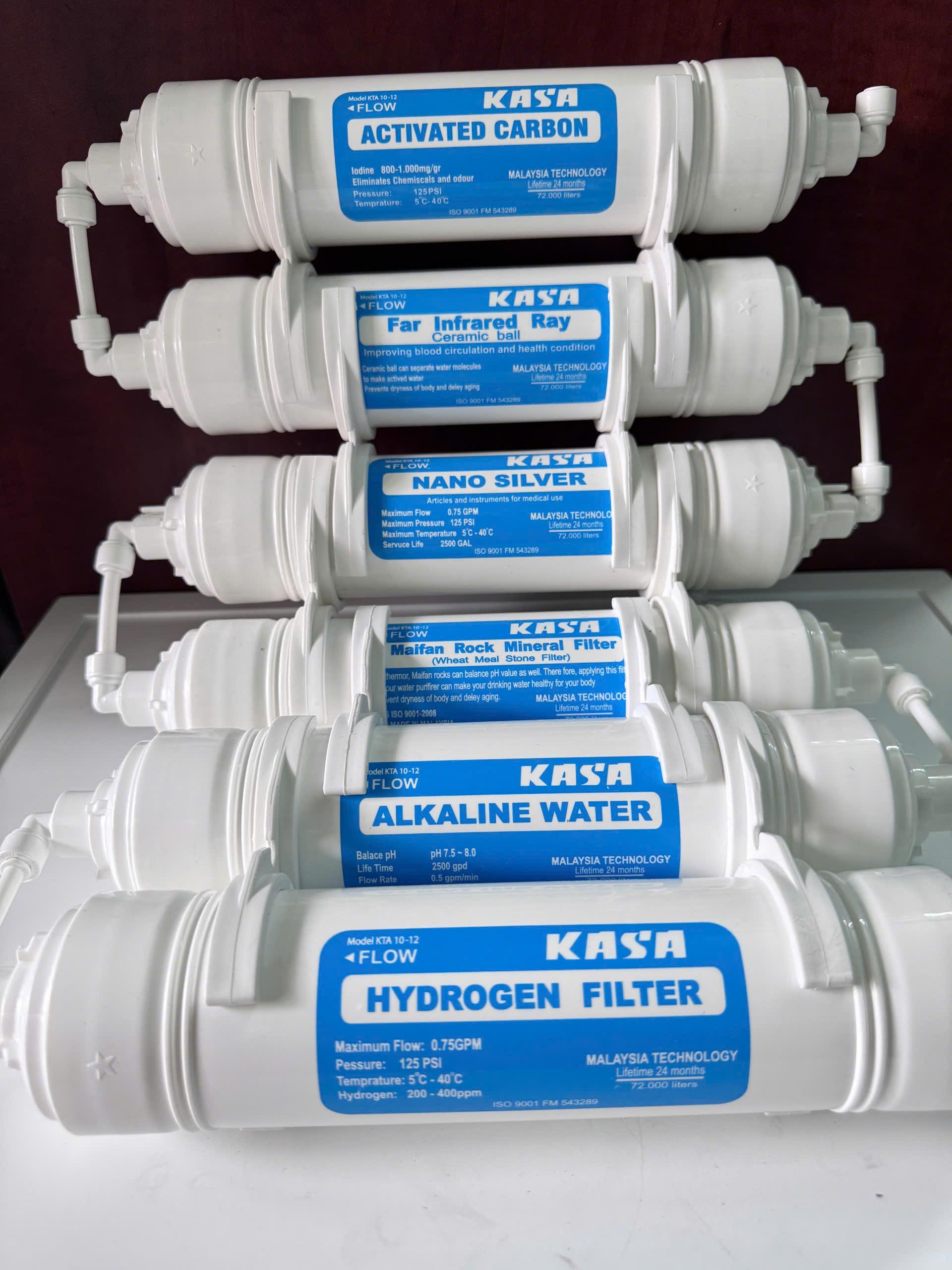 BỘ 6 LÕI KHOÁNG KASA -LÕI CÔNG NGHỆ HYDROGEN THẾ HỆ MỚI BỔ SUNG KHOÁNG CHẤT CẦN CHO CƠ THỂ. Thời gian sử dụng lõi: 18-24 tháng -- Lõi lọc Activated Carbon: Chức năng: Hấp phụ màu, mùi, cân bằng độ pH giúp tăng vị tươi mát của nước - Lõi lọc far Cơ chế bức xạ hồng ngoại để chia các nhóm phân tử nước nhỏ hơn, tăng lượng oxy trong nước để cơ thể có thể hấp thụ dễ dàng hơn, tránh khô da và giảm quá trình lão hóa. - Lõi Nano Silver: Với tính năng rất độc đáo do có màng khử khuẩn cấu trúc tiên tiến được các nhà khoa học hàng đầu Hoa Kỳ nghiên cứu ứng dụng và cải tiến nhiều lần. Lõi lọc nước Nano Silver sẽ giúp các bạn loại bỏ những độc tố từ nguồn nước nhiễm bẩn , Được cấu tạo từ than hoạt tính tích hợp với vật liệu nano bạc nhằm diệt sạch vi khuẩn, nấm có hại nhiễm từ môi trường - Lõi lọc Ankaline là lõi lọc không thể thiếu trong máy lọc nước . Lõi Ankaline với chức năng làm mềm và nước có vị ngon hơn, phù hợp với nhu cầu sử dụng của mọi người, Ổn định lại vị ngọt tự nhiên của nước, cân bằng pH - Lõi lọc maifan (Lõi Khoáng đá): – Lõi lọc khoáng đá có chức năng bổ sung khoáng chất, chất điện giải có ích cần thiết cho cơ thể con người, Làm vị nước ngon hơn. - Lõi lọc Hydrogen (Lõi ORP) Giảm ORP của nước, giúp tăng cường miễn dịch của cơ thể, giảm các bệnh tật do quá trình lão hóa tế bào gây ra. - Nâng cao pH, hỗ trợ cơ thể trung hòa axit dư, chống oxy hóa, tăng cường sức khỏe. Bổ sung khoáng chất, chất điện giải có ích.