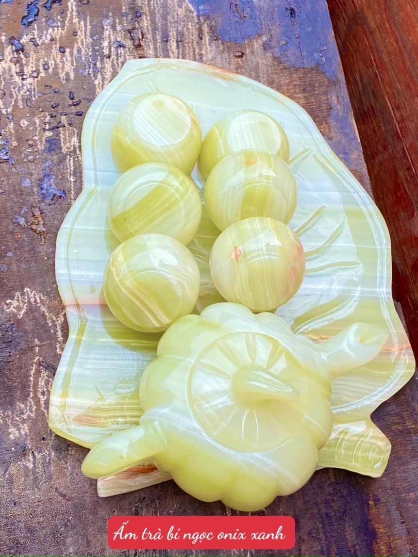 Chất liệu: Đá ngọc Onyx Bộ sản phẩm gồm: 7 dĩa, 6 ly và 1 ấm trà Khối lượng: 1,5 kg Sử dụng làm vật phẩm trang trí nhà cửa, quà biếu hoặc có thể