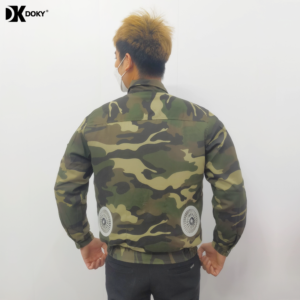 - Áo sử dụng 2 quạt thổi không khí từ ngoài làm mát, giảm nhiệt độ, điều hoà toàn bộ cơ thể.