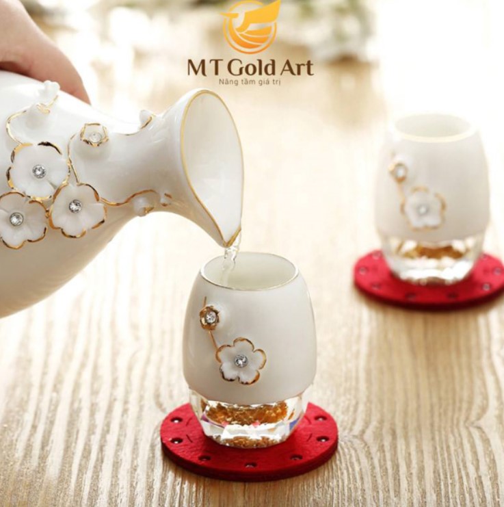 Bộ Bộ bình ly sứ pha lê đúc vàng lá 24k họa tiết hoa mai: bao gồm 1 bình và 6 ly. Đây là sản phẩm đặc biệt trong bộ sưu tập Pha Lê Sứ cao cấp. Sản phẩm không chỉ được tạo nên từ pha lê, gốm sứ cao cấp và vàng lá 24k.
