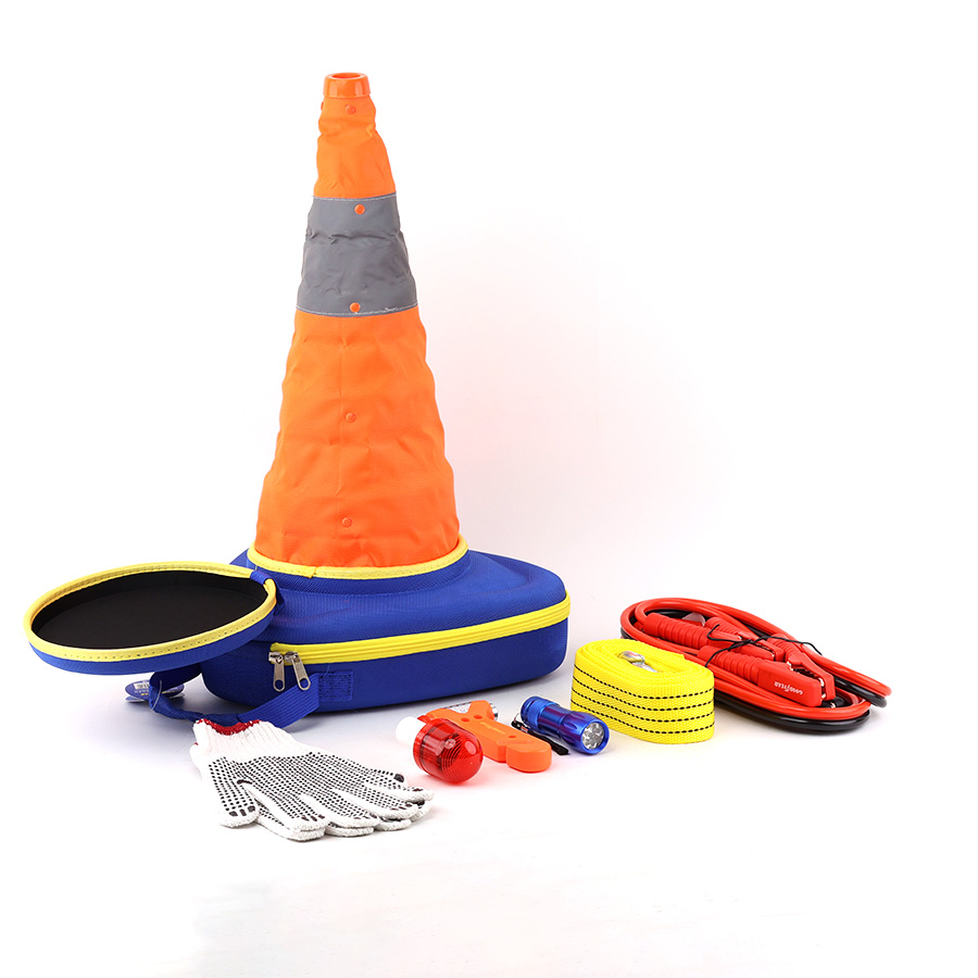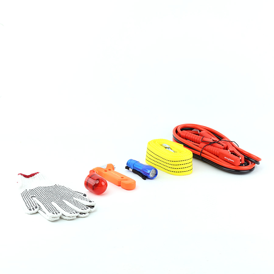 Dây kéo 4m hỗ trợ cứu hộ xe. Đèn pin 9 bóng LED và đèn tín hiệu giúp chiếu sáng và báo hiệu trong tình huống khẩn cấp. Búa thoát hiểm bằng thép không gỉ dùng để phá kính khi cần thoát hiểm. Găng tay chống trơn trượt đảm bảo an toàn khi sử dụng.