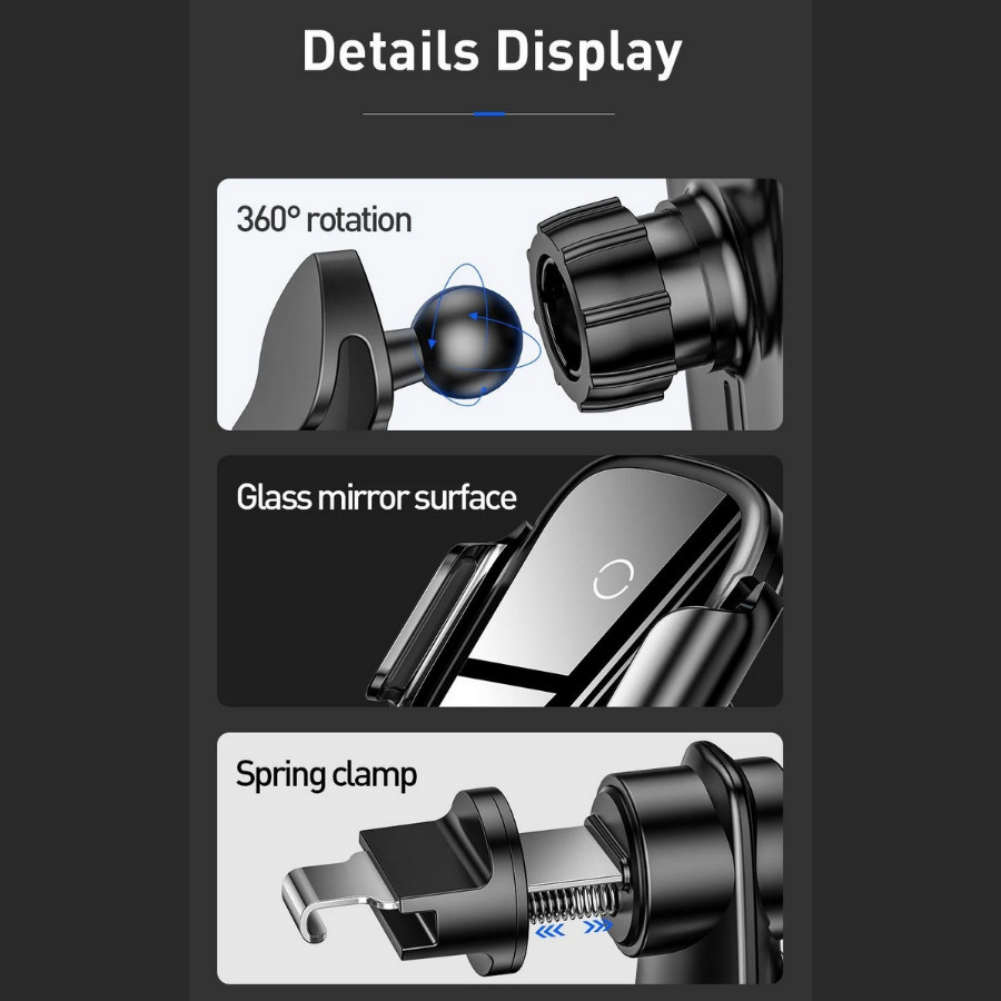 - Giới thiệu Bộ đế giữ điện thoại dùng trên xe hơi Baseus Light Electric Holder Wireless Charger 15W Bộ đế giữ điện thoại dùng cho xe hơi Baseus Light Electric Holder, được tích hợp tính năng sạc nhanh không dây công suất cao 15W và khả năng tự động nhận diện thiết bị bằng cảm biến (Sensor) . Bộ đế giữ điện thoại tích hợp sạc nhanh không dây Baseus Light Electric Holder được thiết kế thông minh, có thể gắn trên táp lô hoặc cửa gió thật sự là một phụ kiện đẳng cấp và hữu ích dành cho chiếc xe hơi của bạn