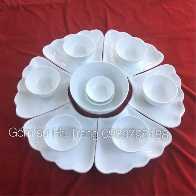 1 set gồm : 1 bát tô , 6 đĩa cánh hoa , 6 bát cơm, 1 bát mắm , 1 đĩa muối