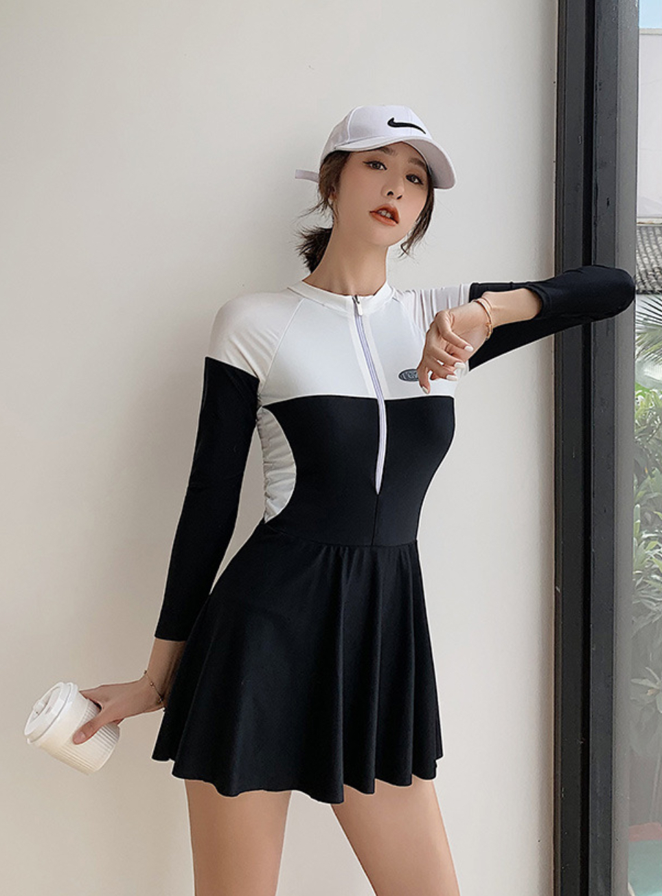 - Chất vải nhung tuyết mềm, co giãn tốt, mặc vừa ôm sát mà vẫn tạo sự mềm mại. - Đồ bơi trắng nhưng nhờ dáng váy chữ A xoè nên mặc sẽ cực kì