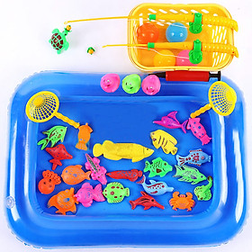 Bộ Đồ Chơi Câu Cá Cho Bé gồm bể phao, các sinh vật biển, cần câu để bé có thể trải nghiệm trò chơi câu cá thú vị ngay tại nhà. Các chú cá được thiết kế nhiều màu sắc, hơn nữa đầu cần câu có gắn nam châm để bé dễ dàng câu được cá hơn, bố mẹ có thể cho nước vào để bé chơi thêm thú vị.