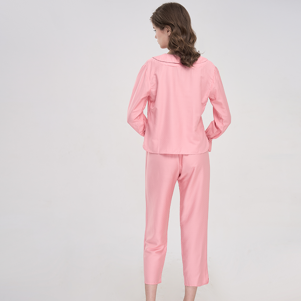Đặc điểm nổi bật: - Cổ lá sen, tay lỡ - Kẹp ren trắng ở phần lá cổ, lai tay, lai quần - Chất liệu thun - Dáng bộ đồ dài - Thiết kế và