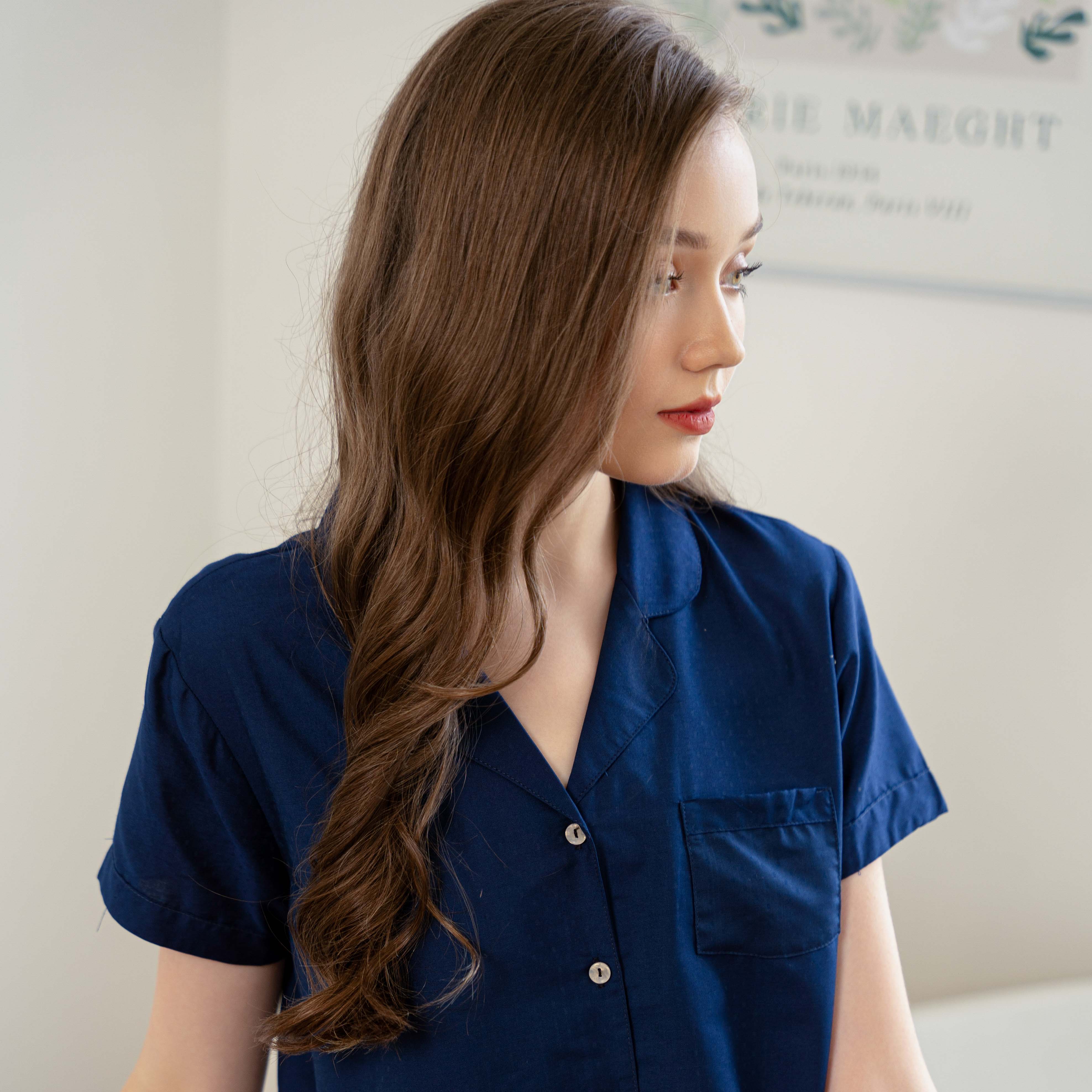 Áo có tay ngắn, cổ áo bo vừa vặn, kết hợp túi trước ngực và được phối viền độc đáo. Dễ dàng phối với bất kỳ quần loại quần mặc nhà nào với màu sắc