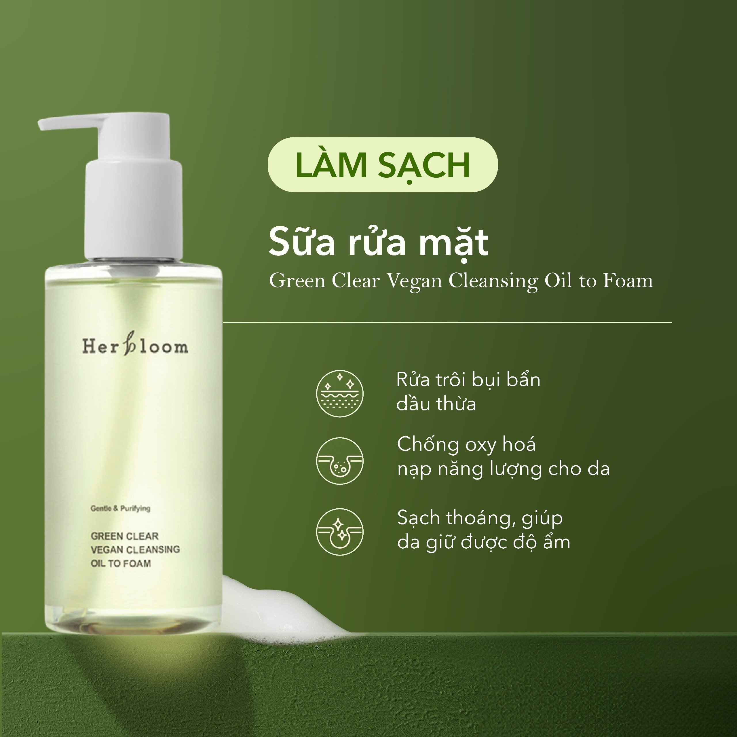 Thương hiệu mỹ phẩm Herbloom ( Hàn Quốc ) Sữa rửa mặt dạng dầu dịu nhẹ dành cho da nhạy cảm HERBLOOM Green Clear Vegan Cleansing Oil To Foam 200ml Thành phần và công dụng