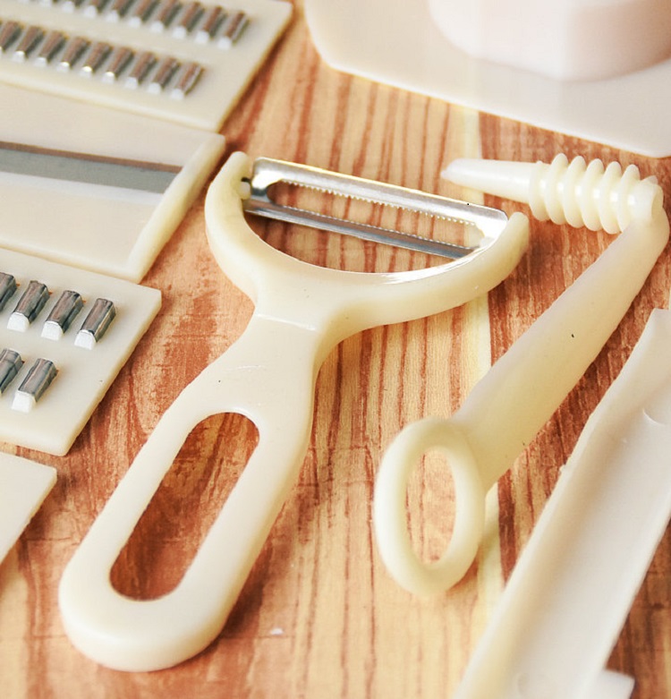 Bộ dao cắt tỉa rau quả đa năng bao gồm: bàn thái, dao gọt vỏ, dụng cụ mài mịn rau củ, dụng cụ xiên rau củ quả và dụng cụ quay tay sẽ giúp bạn cắt tỉa các loại rau củ quả dễ dàng hơn so với dùng dao thông thường. Với thiết kế đơn giản, nhỏ gọn, bộ dụng cụ cắt tỉa rau quả đa năng sẽ giúp cho việc thái rau quả thành hạt lưu, pho mát, thảo mộc tươi một cách nhanh chóng, dễ dàng trong vài phút.