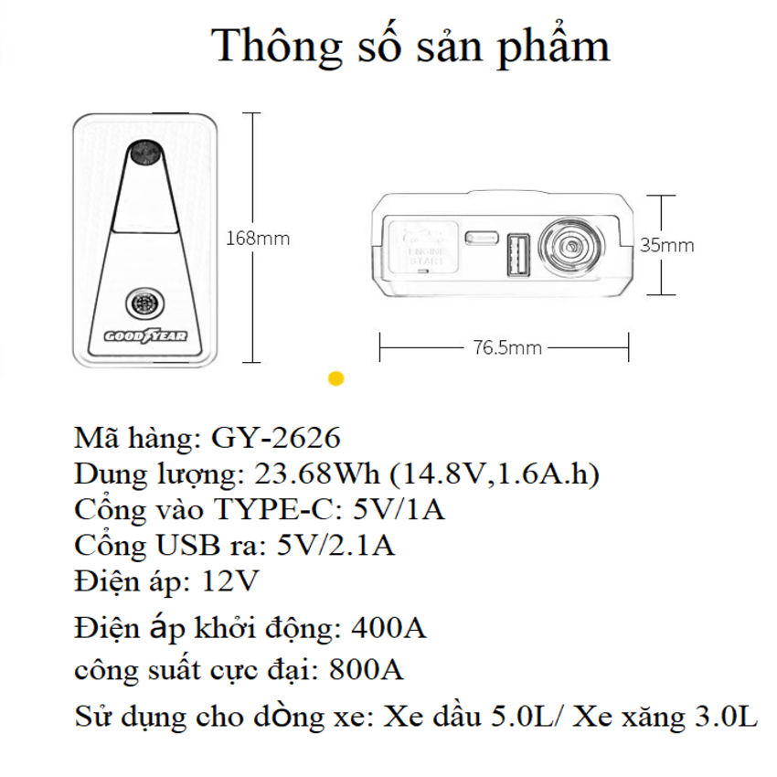 - Được sản xuất từ những linh kiện chất lượng cao với quy trình kiểm soát nghiêm ngặt bộ kích ắc quy ô tô Goodyear GY-2626 có khả năng cung cấp dòng lên đến 800A (peak current) cho phép khởi động gần như tất cả các dòng xe cá nhân và gia đình hiện nay. - -- Bên cạnh đó với dung lượng pin lưu trữ lên đến 12000mAh cho phép bạn có thể khởi động đến 40 lần cho một lần sạc đầy pin.
