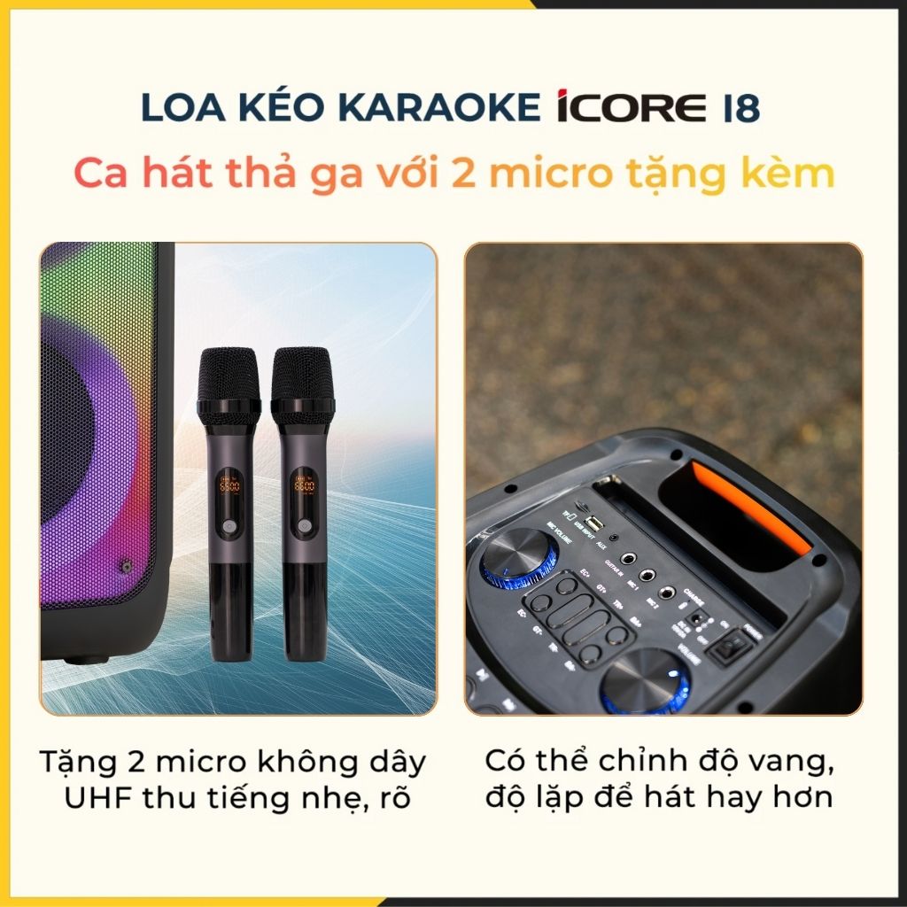 Sản phẩm được tặng kèm 2 micro cao cấp iCore DH10 vốn rất được ưa chuộng của hãng. Chỉ cần vài thao tác kết nôi đơn giản, bạn đã có thể thả ga trình diễn với khả năng điều chỉnh âm lượng nhạc, âm lượng mic và độ vang sao cho phù hợp với không gian và sở thích.