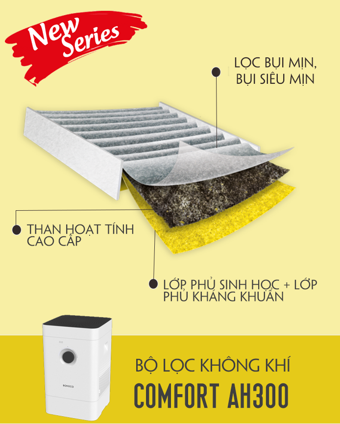 Bộ lọc không khí Comfort AH300 Đặc điểm nổi bật Bộ lọc 4 trong 1 - Lọc sạch đến 99%: Lọc bụi, khử mùi, chống dị ứng và truyền dịch kháng khuẩn Làm bất hoạt chất gây dị ứng Giảm thiểu sự lây lan của vi sinh vật trên bộ lọc Giảm các hạt mịn (PM2,5) lên đến 99% Loại bỏ mùi hôi Liên kết các loại khí độc hại như ozone, oxit nitric và sulfur dioxide Mô tả sản phẩm Lớp 1: lọc bụi thô Cấu tạo lọc hiệu suất cao làm giảm gần như 100% các hạt thô như bụi, phấn hoa hoặc mài mòn lốp xe cũng như các hạt nhỏ nhất như bụi mịn. Lớp 2: than hoạt tính cao cấp Việc sử dụng hạt than hoạt tính chất lượng cao giúp loại bỏ mùi hôi và khí độc hại như ozone, lưu huỳnh điôxit hoặc nitơ oxit. Lớp 3 +4: bộ lọc sinh học Lớp phủ sinh học đặc biệt với polyphenol tự nhiên bắt dính các chất gây dị ứng miễn phí. Lớp phủ kháng khuẩn bổ sung hạn chế sự phát triển của vi khuẩn và nấm mốc trên bộ lọc. Sử dụng: Máy tạo độ ẩm & lọc HYBRID H300