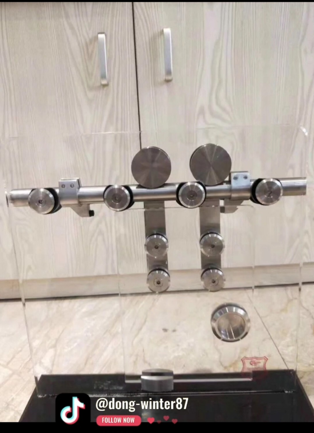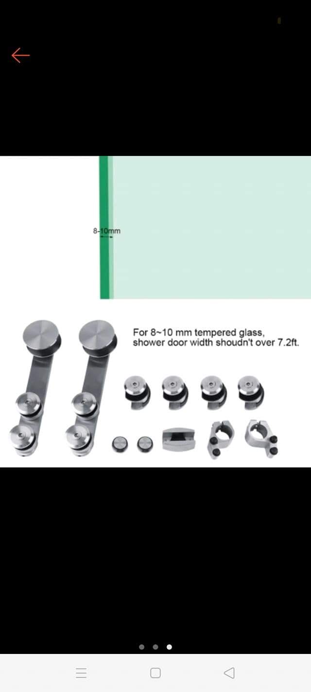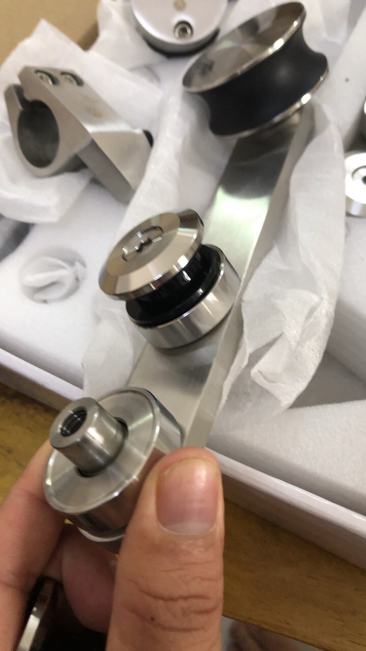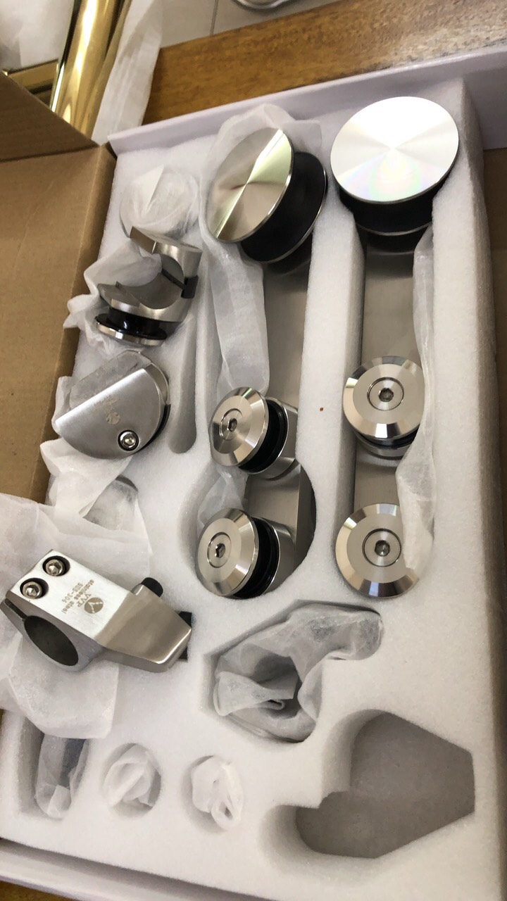 bộ lùa treo  gồm : 2 bánh xe, loại bắt lục, siết cực kì chắc, inox 304 loại mờ 4 con đỡ ống inox 2 chặn kính 1 định vị dẫn hướng 2 đầu bịt