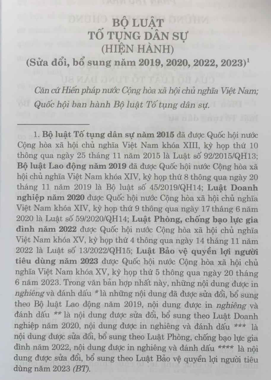 Để thuận tiện cho bạn đọc trong việc tìm hiểu và áp dụng Bộ luật Tố tụng dân sự, Nhà xuất bản Chính trị quốc gia Sự Bộ luật Tố tụng dân sự (hiện hành) (sửa đổi, bổ sung năm 2019, 2020, 2022, 2023). Nội dung cuốn sách là văn bản hợp nhất Bộ luật Tố tụng dân sự năm 2015 với nội dung sửa đổi, bổ sung Bộ luật Tố tụng dân sự năm 2015 của Bộ luật Lao động năm 2019, Luật Doanh nghiệp năm 2020, Luật Phòng, chống bạo lực gia đình năm 2022 và Luật Bảo vệ quyền lợi người tiêu dùng năm 2023.