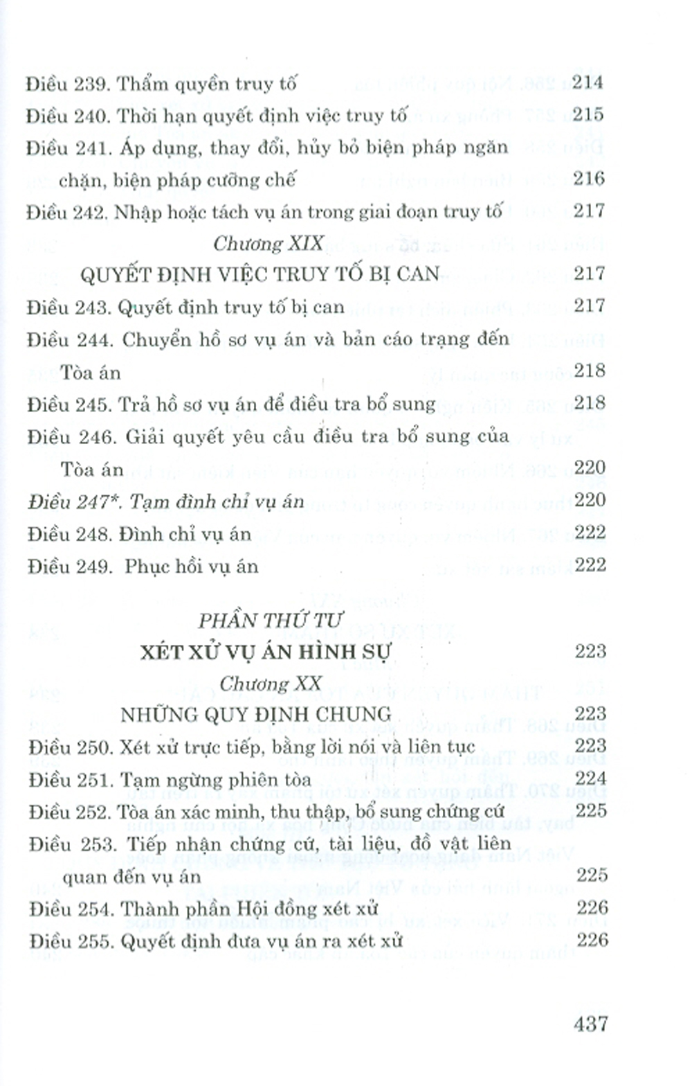 Cuốn sách gồm 9 phần, 510 điều, quy định trình tự, thủ tục tiếp nhận, giải quyết nguồn tin về tội phạm, khởi tố, điều tra, truy tố, xét xử và một số thủ tục