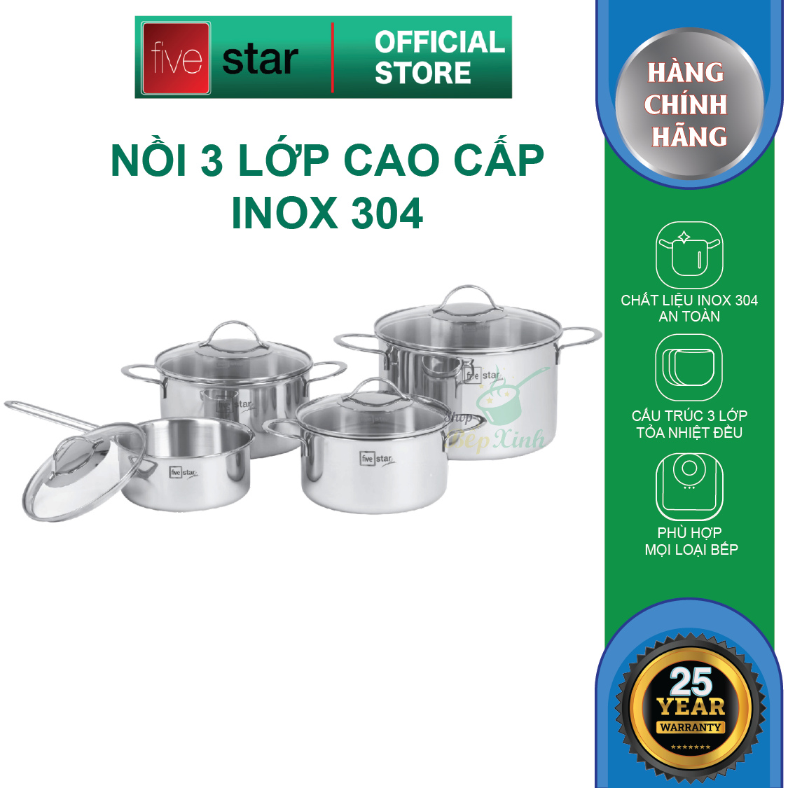 Bộ nồi Five Star Cao Cấp inox 304 Kitchi Nắp Kính mới