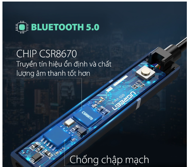 - Thiết bị phát âm thanh Bluetooth 5.0 cao cấp Ugreen 50213 là phụ kiện chuyên dụng dùng để kết nối mọi nguồn phát âm thanh có cổng audio 3.5mm như Tivi, Laptop, PC, Đầu CD/DVD, Tivibox… với các thiết bị thu bluetooth như tay nghe, loa, amply … sử dụng chipset Qualcomm aptX và chuẩn Bluetooth 5.0 mang đến trải nghiệm âm thanh đạt chuẩn HiFI sống động.