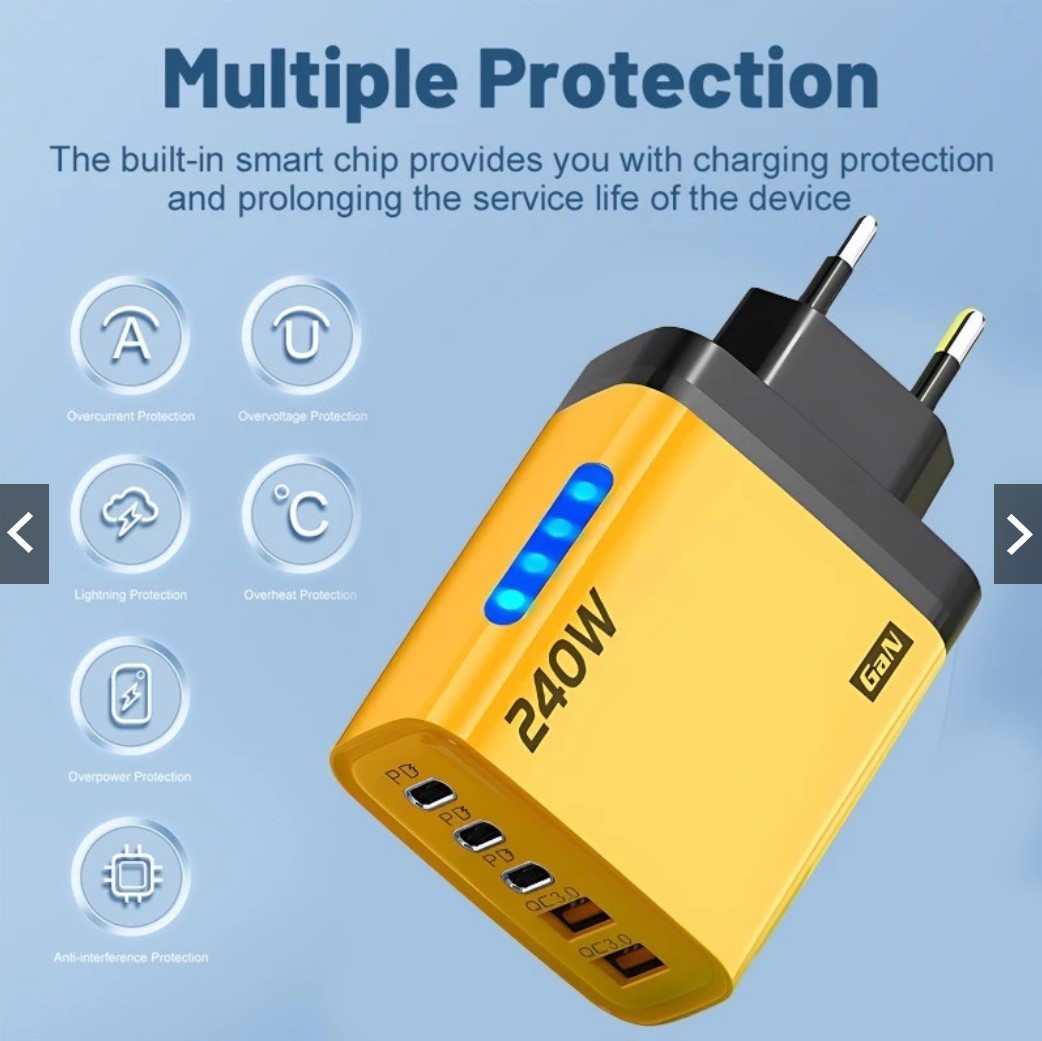 “Nội dung đóng gói ”: Sản phẩm bạn mua bao gồm USB kép 240W + 3PD với bộ sạc LED, cung cấp các giải pháp sạc hiệu quả và đáng tin cậy cho tất cả các thiết bị của bạn bất cứ lúc nào.