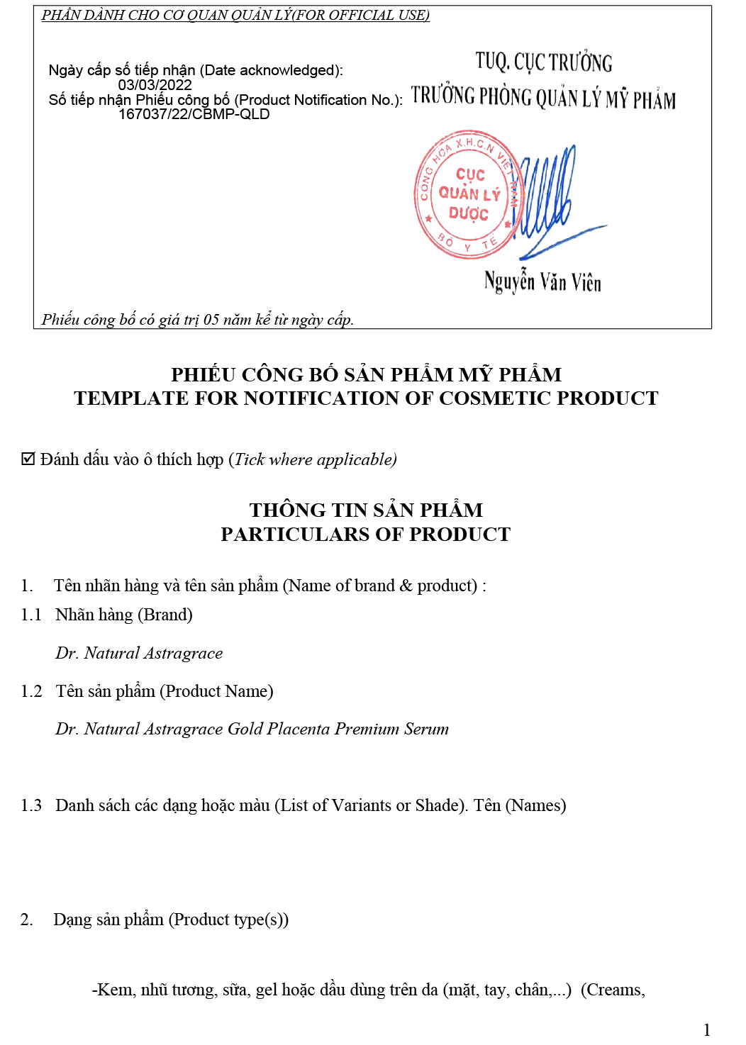 SERUM VÀNG Dr. Natural Astragrace Gold Placenta Premium Serum
