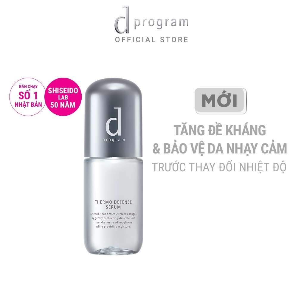 - SERUM D PROGRAM DƯỠNG DA BẢO VỆ CHUYÊN SÂU Sản phẩm serum dưỡng da bảo vệ chuyên sâu DPROGRAM được sản xuất tại Nhật là sản phẩm duy nhất trên thị trường nghiên cứu bảo vệ da trước thay đổi nhiệt độ từ môi trường. Sản phẩm được sử dụng ở bước đầu tiên trong qui trình chăm sóc da, đóng vai trò trong việc tăng sức đề kháng cho da, tăng cường tuần hoàn máu do đó giúp da ổn định trước nhiệt độ thay đổi từ môi trường. Ngoài ra sản phẩm còn có tác dụng hổ trợ thẩm thấu dưỡng chất nhanh chóng vào trong da. Sản phẩm dùng được cho mọi loại da đặc biệt là da nhạy cảm Serum dưỡng da bảo vệ chuyên sâu của DPROGRAM được phát triển dựa trên nhưng nghiên cứu chuyên sâu về da nhạy cảm từ phòng nghiên cứu 50 năm của SHISEIDO là sản phẩm tiên phong trong việc bảo vệ da trước những thay đổi nhiệt độ từ môi trường gây những tác hại không mong muốn cho da. Bên cạnh đó sản phẩm đóng vai trò như pre-serum được dùng ở bước đầu tiên trong quy trình dưỡng da hàng ngày với tác dụng cải thiện và cân bằng độc ẩm, giúp thúc đẩy dưỡng chất thẩm thấu vào da dưỡng da mềm mịn và ẩm mượt mà không gây bít tắt lỗ chân lông. Sản phẩm serum dưỡng da bảo vệ chuyên sâu DPROGRAM được sản xuất tại Nhật là sản phẩm duy nhất trên thị trường nghiên cứu bảo vệ da trước thay đổi nhiệt độ từ môi trường. Sản phẩm được sử dụng ở bước đầu tiên trong qui trình chăm sóc da, đóng vai trò trong việc tăng sức đề kháng cho da, tăng cường tuần hoàn máu do đó giúp da ổn định trước nhiệt độ thay đổi từ môi trường. Ngoài ra sản phẩm còn có tác dụng hổ trợ thẩm thấu dưỡng chất nhanh chóng vào trong da. Sản phẩm dùng được cho mọi loại da đặc biệt là da nhạy cảm Thành phần nổi bật: