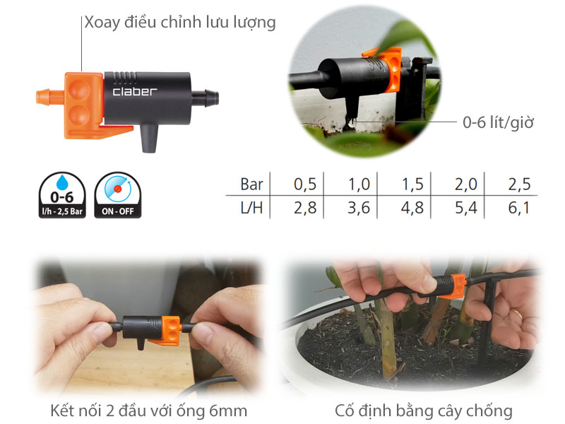 Có thể vặn đầu cam để điều chỉnh lưu lượng nước nhỏ giọt Bảng lưu lượng theo áp lực nước