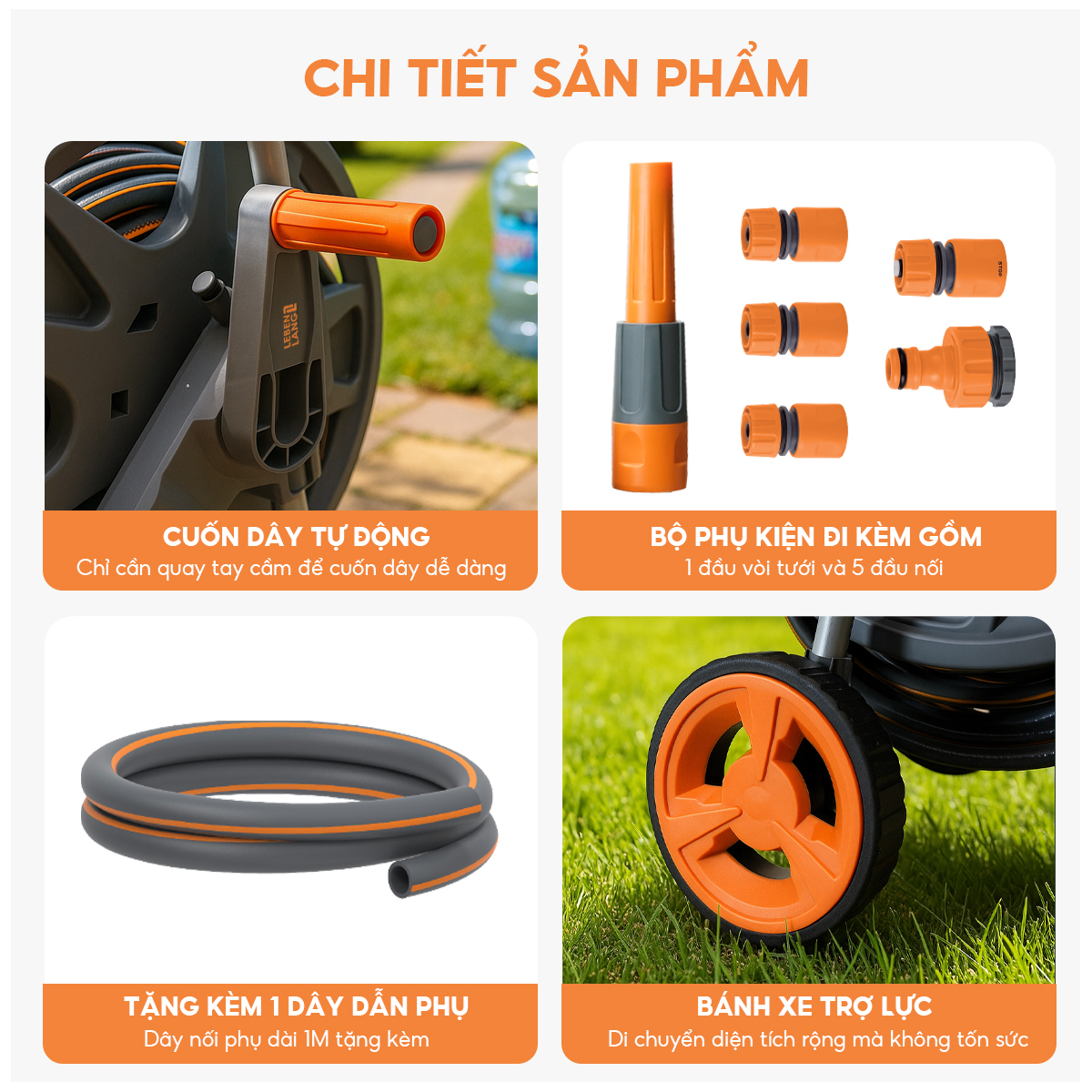 - Bộ vòi phun tưới cây LBLB3365 Bánh xe trợ lực giúp di chuyển nhẹ nhàng trên nhiều bề mặt; có thể tháo lắp dễ dàng khi cần cất gọn
