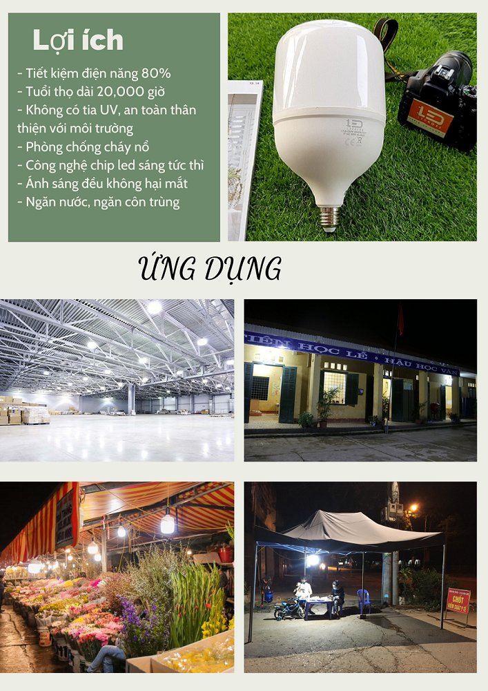 Công suất đèn 30W Đầu đèn: E27 Ánh sáng: Trắng / Vàng Quang thông: 2500 lm Kích thước (ØxH): (120 x 218) mm Sử dụng Sử dụng Chip LED Samsung đạt độ tin cậy cao