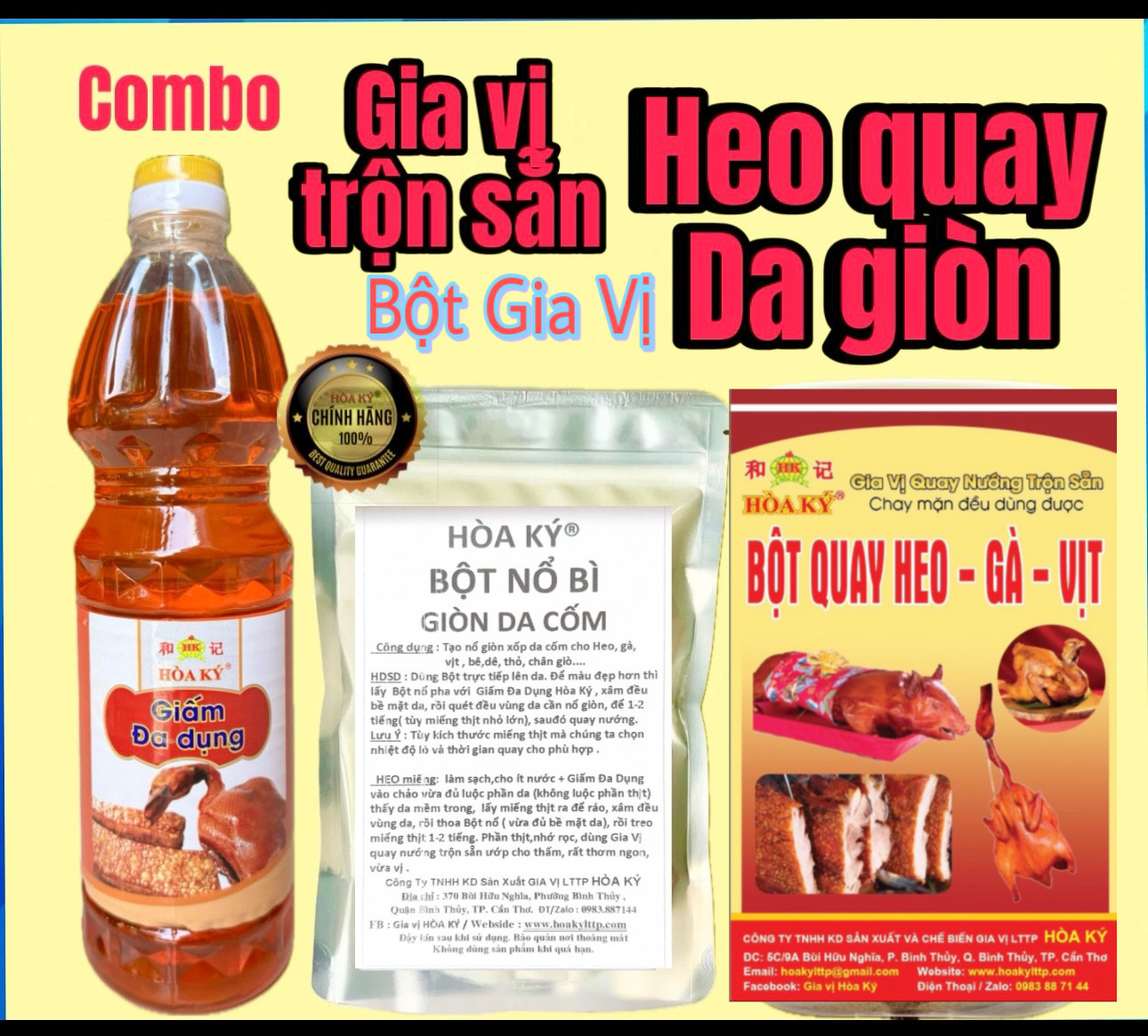 BỘT NỔ BÌ GIÒN DA CỐM Combo quay nướng đầy đủ gia vị, không cần nêm thêm. Gồm có : Bột nổ bì giòn da cốm Gia vị trộn sẵn ướp phần thịt Giấm (Dấm) đa dụng tạo màu đẹp ,da giòn . Thực phẩm : cho Heo, gà,  vịt , bê,dê, thỏ, chân giò, chim bồ câu ….tạo nổ giòn xốp da cốm, thịt thấm vừa ăn thơm ngon .   Công dụng của Bột : Tạo nổ giòn xốp da cốm cho Heo, gà,  vịt , bê,dê, thỏ, chân giò.... HDSD : Dùng Bột trực tiếp lên da để nổ bì da . Quay da bóng giòn màu đẹp thì lấy  Bột  nổ pha với  Giấm Đa Dụng Hòa Ký ; xâm đều bề mặt da, rồi quét đều vùng da cần nổ giòn, để 1– 2 tiếng hong gió ( tùy miếng thịt nhỏ lớn), sau đó quay nướng. Lưu Ý : Tùy kích thước miếng thịt mà chúng ta chọn nhiệt độ lò và thời gian quay cho phù hợp .   HEO miếng:  làm sạch miếng thịt heo. Rồi cho (ít nước + ít Giấm Đa Dụng ) vào chảo vừa đủ luộc phần da  miếng thịt (không luộc phần thịt) thấy da mềm trong là lấy ra để ráo, xâm đều vùng da. Sau đó thoa Bột Nổ (vừa đủ) trực tiếp lên phần da ,hong gió 1– 2tiếng, rồi mới quay nướng. Phần thịt,nhớ rọc, dùng Gia Vị quay nướng trộn sẵn ướp cho thấm, rất thơm ngon.   Dùng gia vị ít hay nhiều đều được ( tuỳ khẩu vị) . Dùng được cho món Chay.