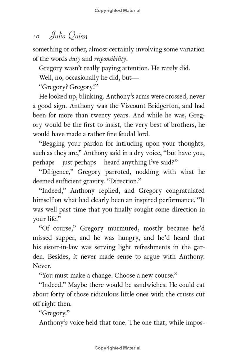From #1 New York Times bestselling author Julia Quinn comes the story of Gregory Bridgerton, in the final installment of her beloved Regency-set novels featuring the charming, powerful Bridgerton family, now a series created by Shondaland for Netflix.