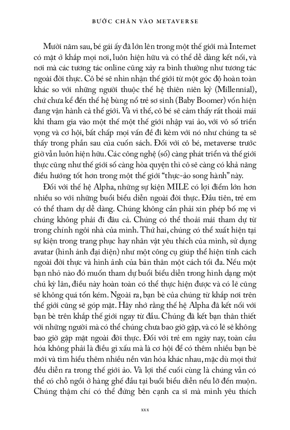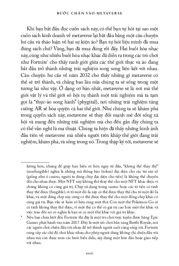 “Ở dạng cơ bản nhất, metaverse sẽ là nơi mà thế giới vật lý và thế giới số hội tụ thành một trải nghiệm mà ta tạm gọi là ‘thực-ảo song hành’, nơi những trải nghiệm tăng cường AR sẽ hòa quyện cả hai thế giới. Như chúng ta sẽ khám phá trong quyển sách này, metaverse sẽ làm thay đổi mạnh mẽ đời sống xã hội và mang đến những trải nghiệm mà cho đến gần đây chúng ta có thể vẫn nghĩ là ma thuật.” - trích sách