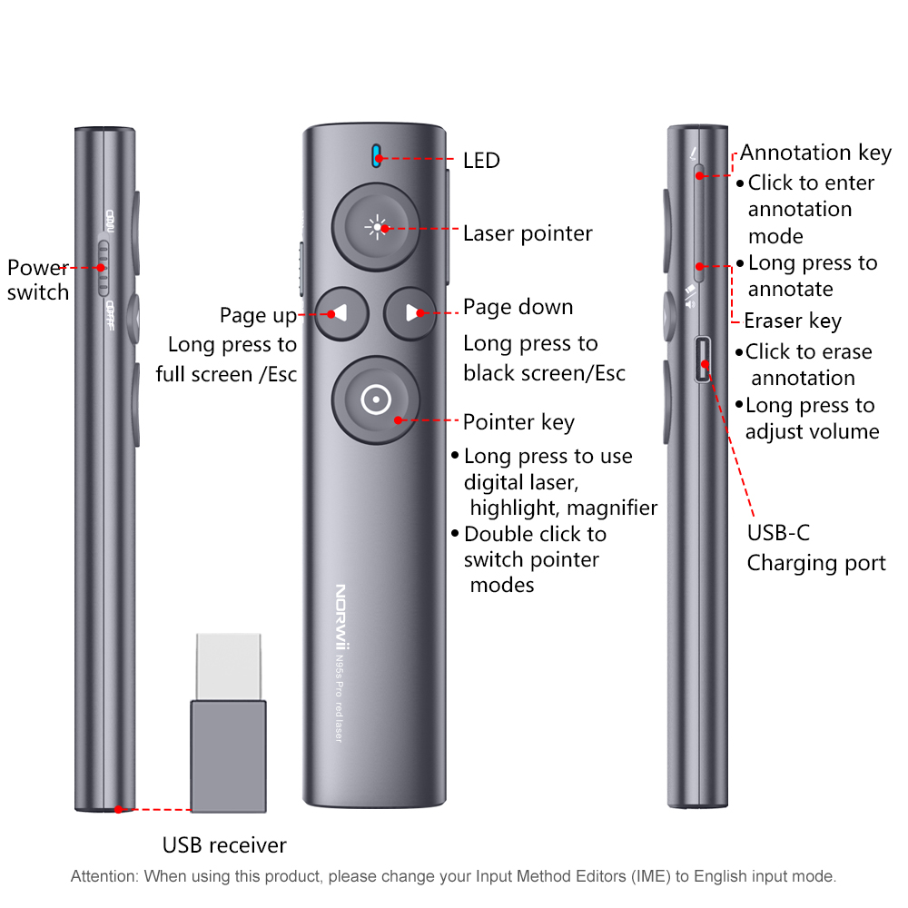 Bút trình chiếu NORWii N95 Pro Spotlight cao cấp 2in1 Thông số kỹ thuật :  Model : NORWii N95 Pro SPOTLIGHT Kết nối : 2.4GHz Đầu USB 2in1 :thu phát Wireless 2.4Ghz và USB dung