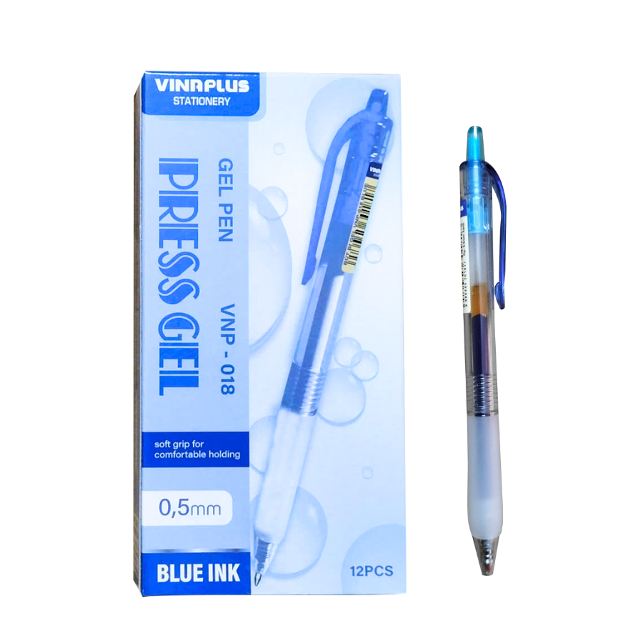 Bút Viết Gel Nước Dạng Bấm Vinaplus VNP-018 Ngòi 0.5mm (Mực Xanh, Đen), Viết Êm, Mực Đều MÔ TẢ SẢN PHẨM: Bút gel Vinaplus VNP-018 có đặc điểm: - Đầu bi 0.5mm, mực bút dạng