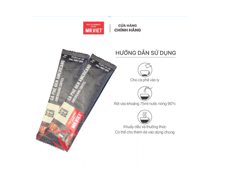 - Cà Phê Hòa Tan Đen MR.VIET mang hương vị đậm đà của hạt cà phê Arabica chất lượng cao với công nghệ sấy lạnh hiện đại giữ được hương vị cũng như hàm lượng