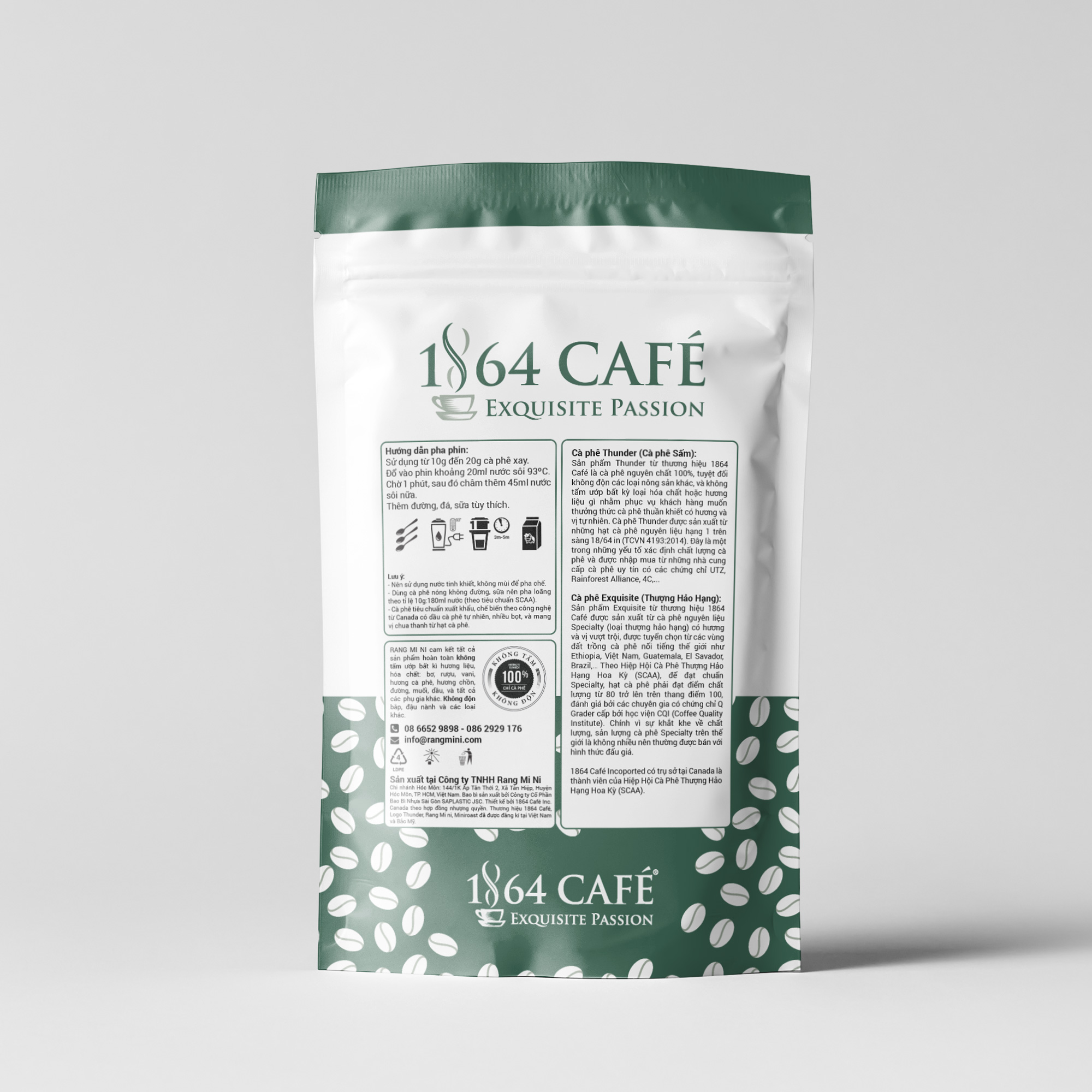 Tất cả sản phẩm Thương hiệu 1864 CAFÉ đều sử dụng hạt xanh nguyên liệu chất lượng cao Hạng 1, cỡ hạt trên sàng 18/64 in (theo TCVN 4193: 2014), Sản phẩm thành phẩm được bảo quản trong bao bì hợp kim Aluminium tối thiểu phải trên 5 lớp, đạt chuẩn ATVSTP có van 1 chiều chống oxy hóa và Zip lock tiện lợi.