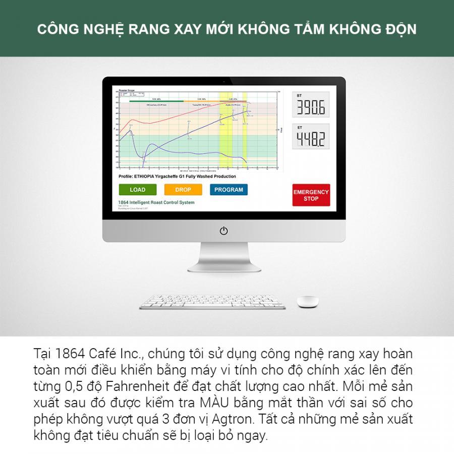 -         Công nghệ rang xay mới từ 1864 Café Inc. Canada giữ nguyên hương thơm và vị ngon tuyệt vời của hạt cà phê, chính xác đến từng 0,5 độ Fahrenheit. Mỗi mẻ sản xuất sau đó được kiểm tra MÀU bằng mắt thần.