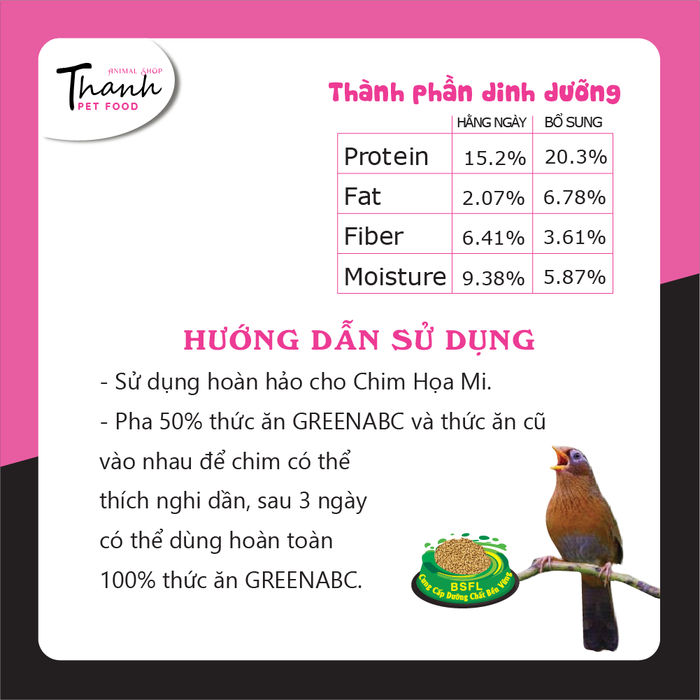 GREENABC - THỨC ĂN CHIM HỌA MI HÀNG NGÀY & BỔ SUNG GREENABC là thức ăn cao cấp dành cho CHIM HỌA MI. Đặc biệt sản phẩm GREENABC được sản xuất theo phương pháp Áp dụng công nghệ PROTEIN bền