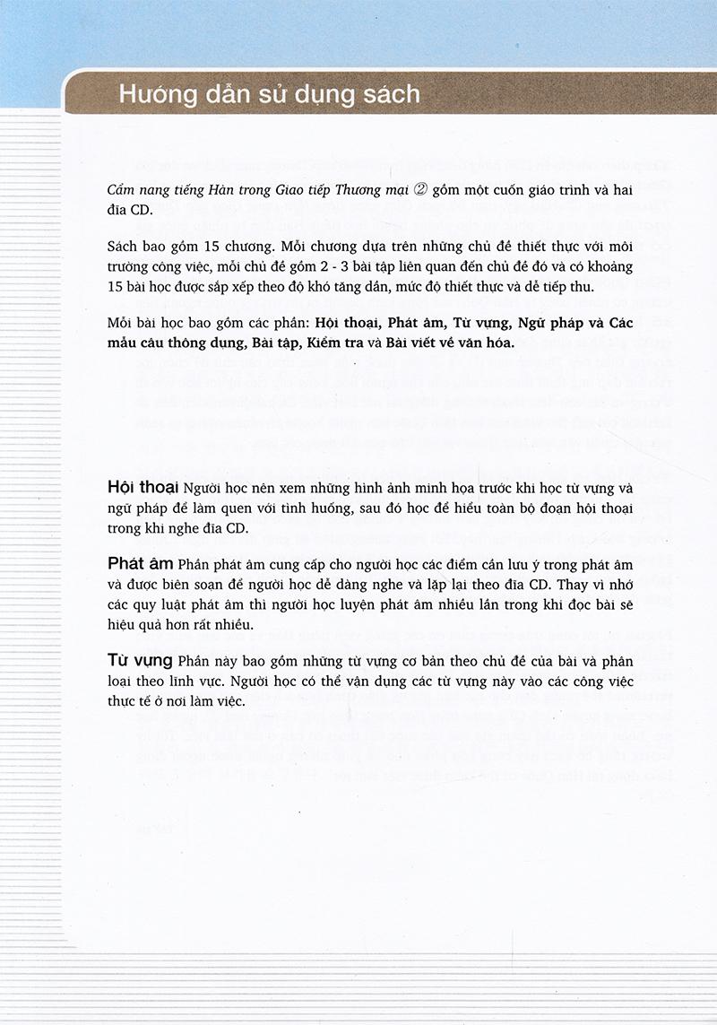 Mong rằng bộ sách Cẩm nang tiếng Hàn trong Giao tiếp Thương mại sẽ là một bộ giáo trình thiết thực, giúp ích cho các lao động người nước ngoài có thể học ngôn ngữ và tìm hiểu văn hoá Hàn quốc một cách dễ dàng và thú vị hơn. Mong rằng quyển sách này có thể giúp mở rộng vốn hiểu biết về ngôn ngữ tiếng Hàn cho mọi người.