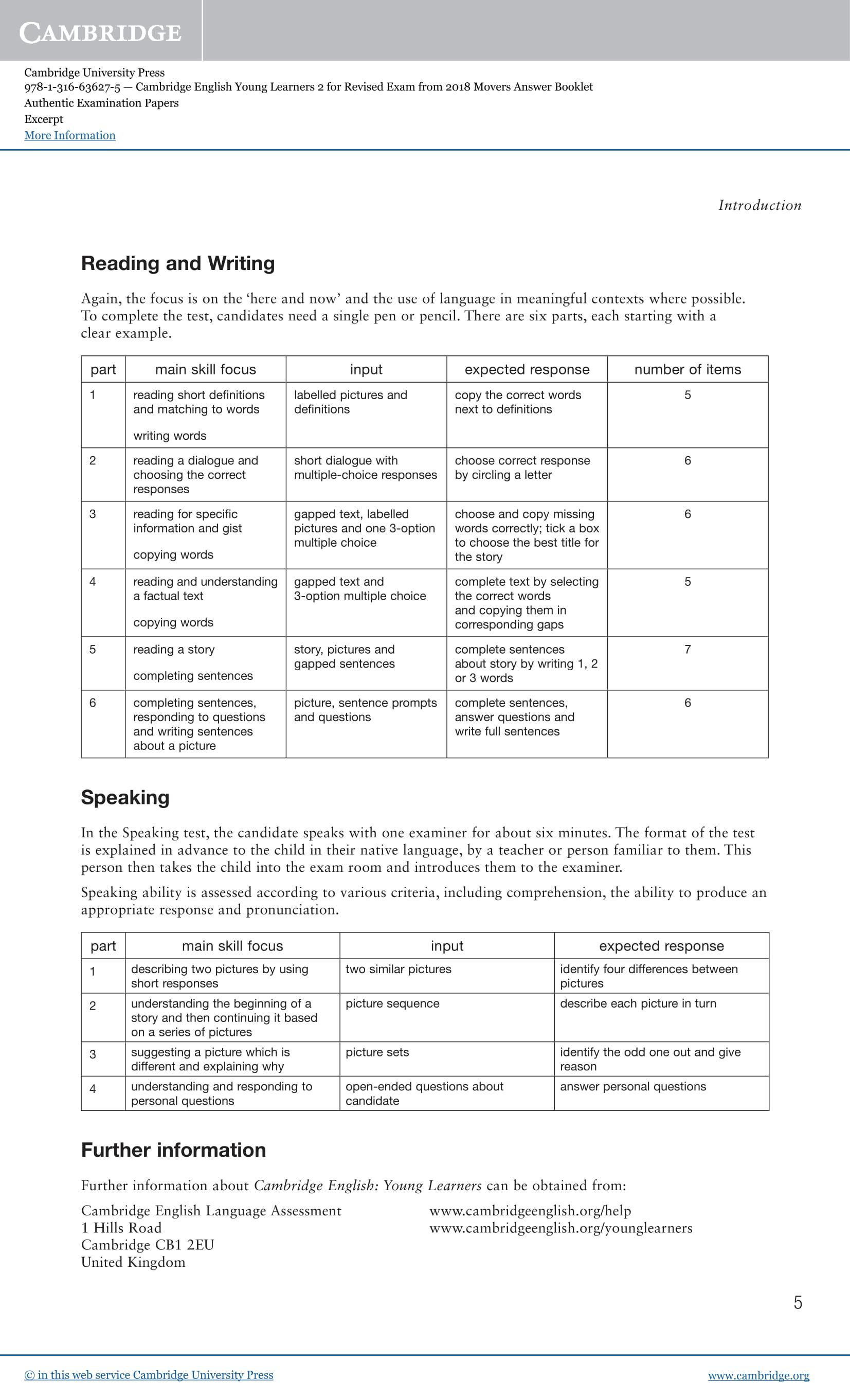 It contains answers for all three tests, the audioscripts and examples of the type of interchange to expect in the Speaking test. It also includes the Movers Vocabulary list, organised by theme. An Audio CD (which contains the listening sections of the tests) and the Student's Book are available separately.