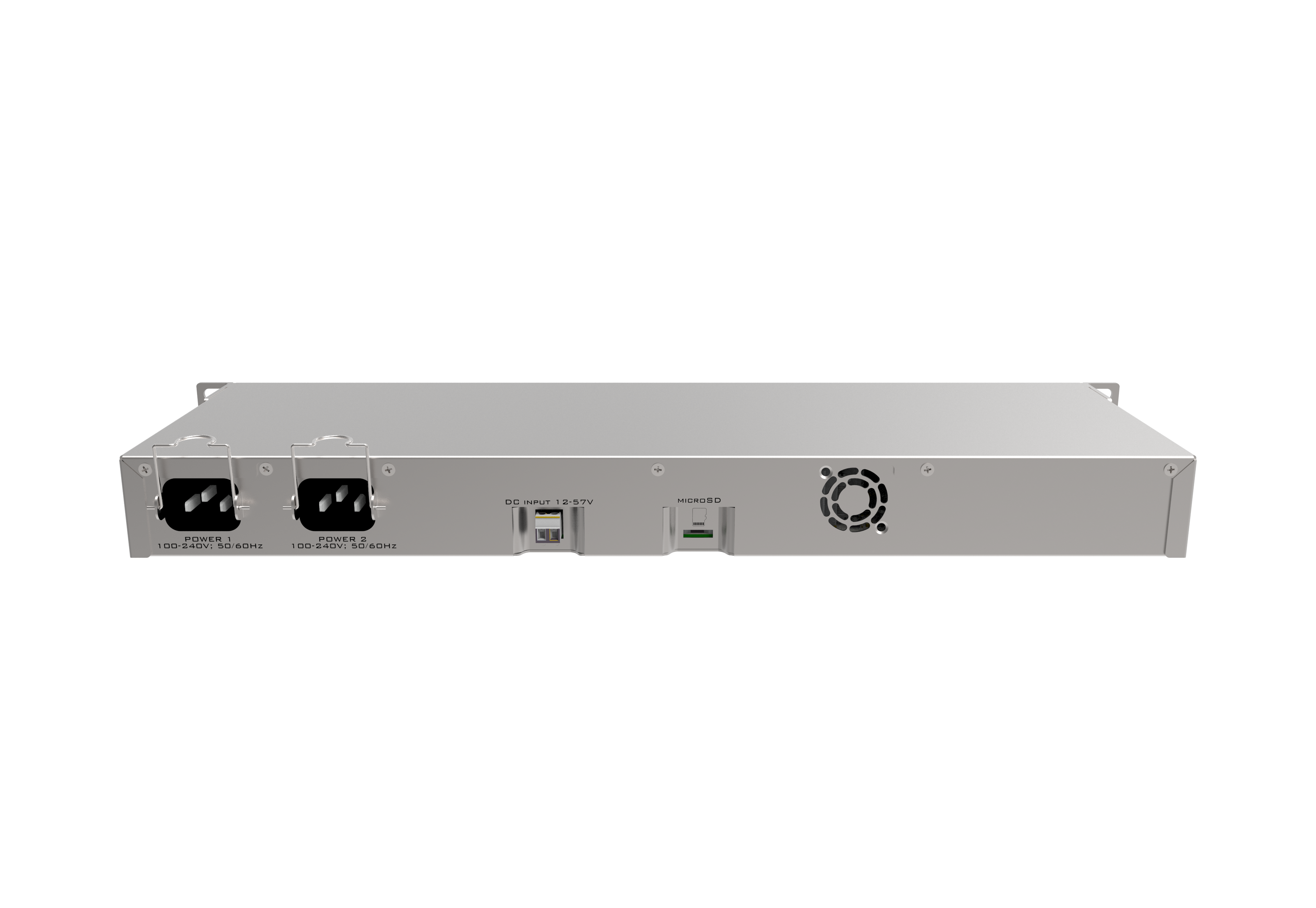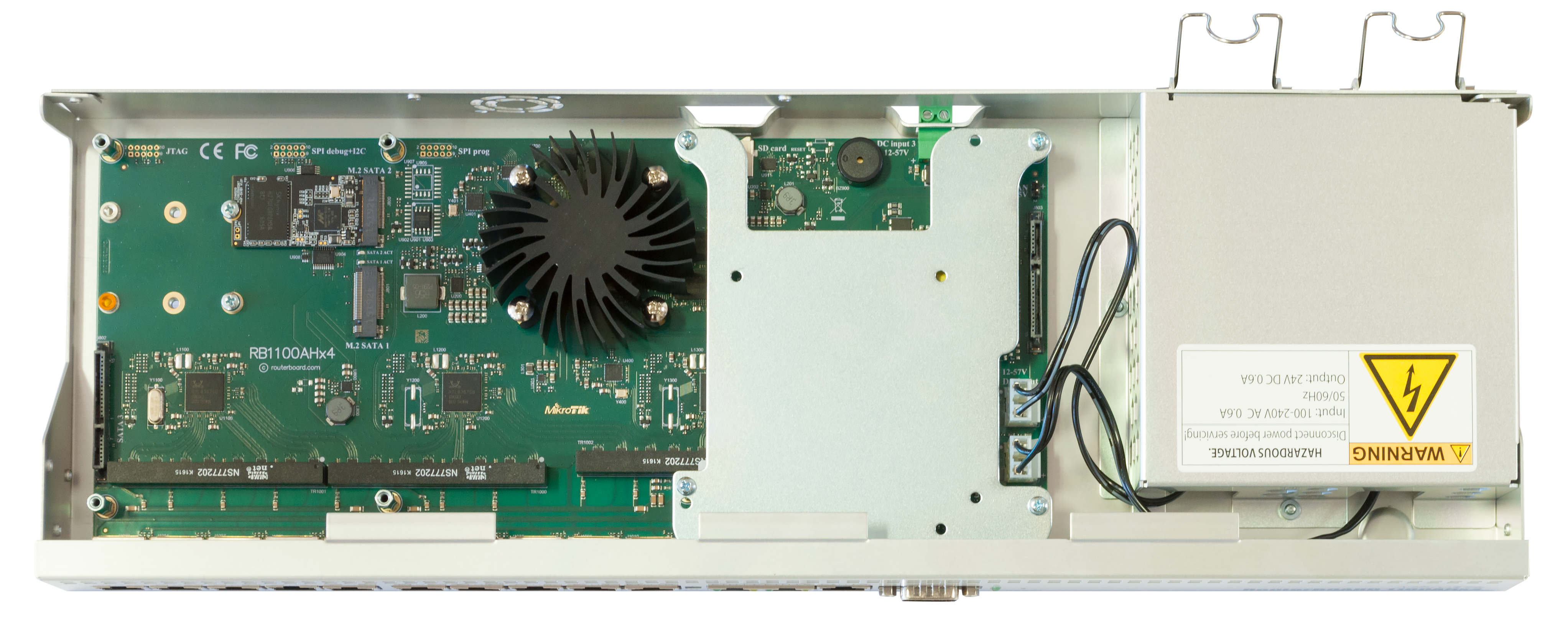 Unit comes with 1U rackmount case, 13x Gigabit Ethernet ports, RS232 serial port and dual redundant power supplies (with -48v DC telecom power and 802.3at/af support). The RB1100AHx4 Dude edition features several high speed storage connectors (two SATA and two M.2) for using a Dude database, proxy cache or any other storage intensive feature. It includes a 60GB M.2 drive already installed.