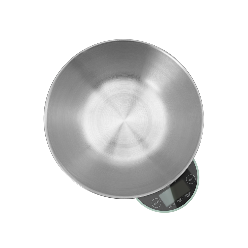 Vỏ kim loại tráng phủ bột mịn Chân chống trượt Phạm vi đo lên đến 5 kg (11 lb) Tổng (kể cả bát): xấp xỉ W 24,5 x H 21,2 x D 24,5 cm Bát: