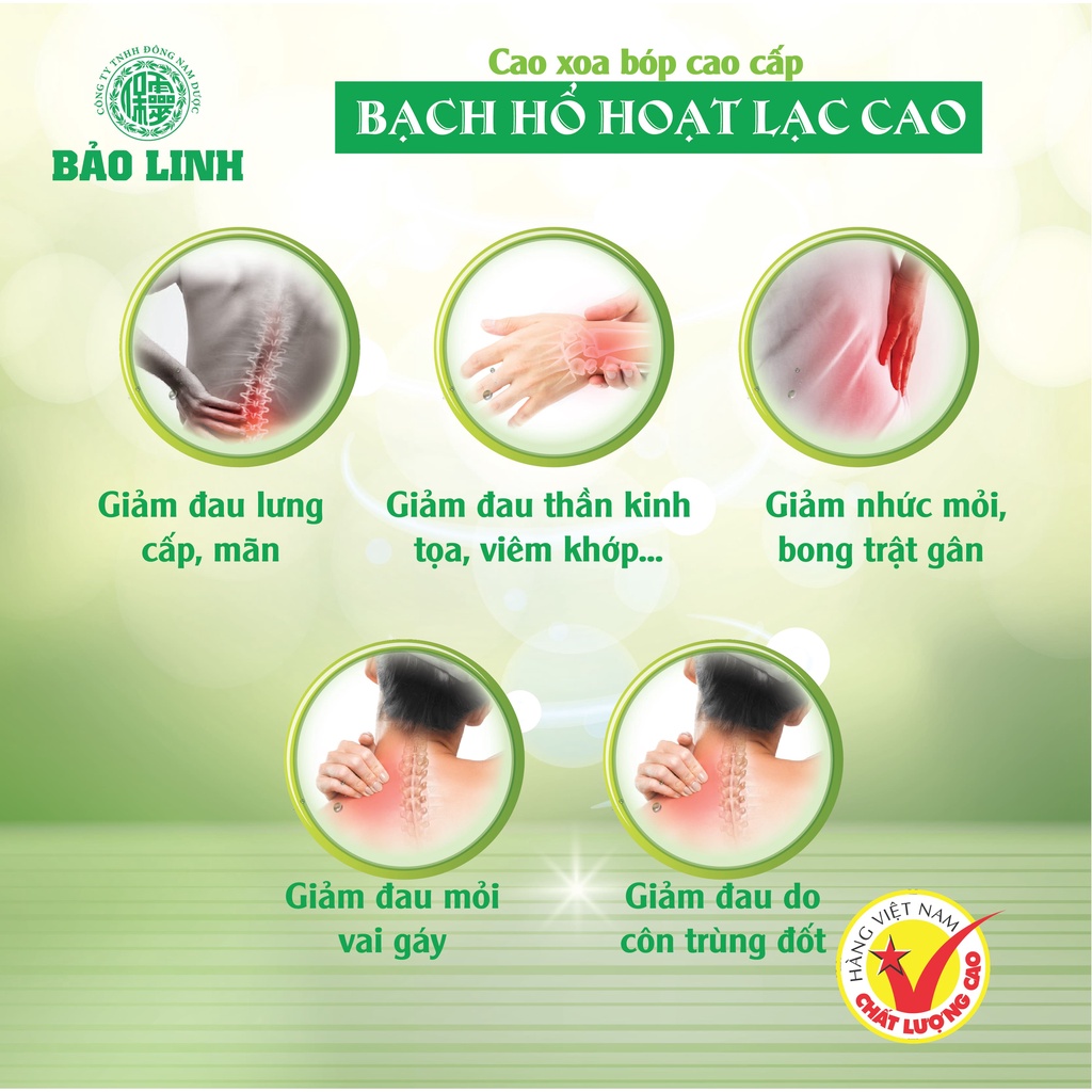Cao xoa bóp Bạch Hổ Hoạt Lạc Cao Bảo Linh trị các chứng đau lưng cấp, mãn, đau thần kinh tọa, té ngã