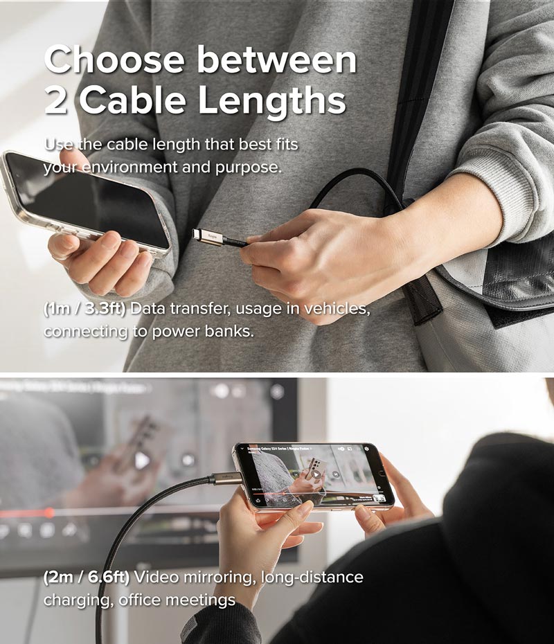 Nhiều phân loại kích thước lựa chọn Có 2 phân loại chiều dài khác nhau giúp bạn lựa chọn: 1m và 2m. Chiều dài cáp 1m phù hợp sử dụng trên bàn làm việc hoặc xếp gọn mang đi mọi nơi. Với chiều dài cáp 2m sẽ phù hợp ở các không gian như giường ngủ, ghế sofa…mang đến sự thoải mái tiện dụng khi sạc thiết bị hơn.