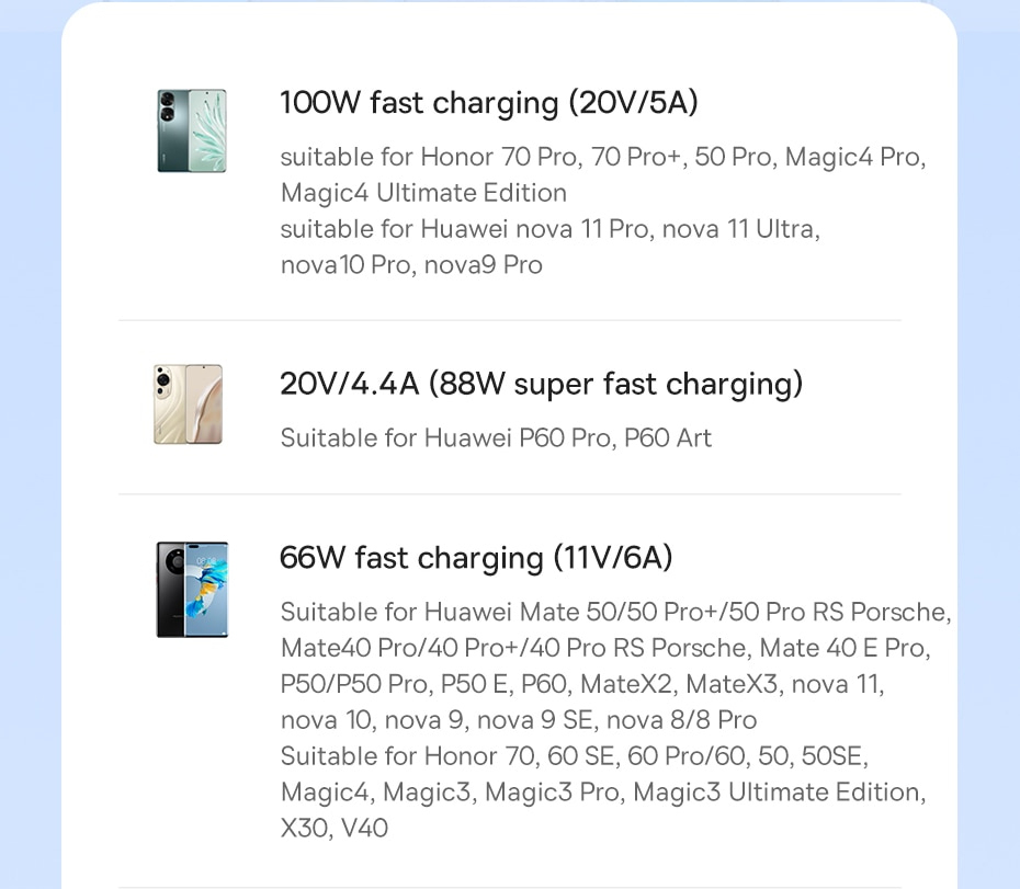 + 66W(11V/6A) sạc nhanh: Huawei P50/P50 Pro, Mate 40 Pro/40 Pro +/40 Pro RS, Mate X2, Nova 8/8 Pro. Honor 60/60 Pro, V40, 50, 50SE, Magic 3/3 Pro…