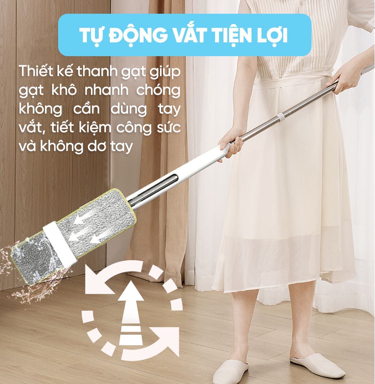 • Không cần dùng tay tiện lợi, thiết kế thông minh chỉ cần đẩy nhẹ kéo cây lau nhà sẽ tự động vắt không dơ tay.