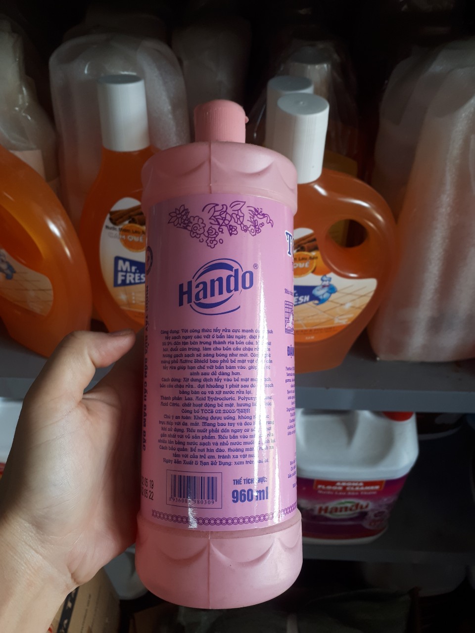 Tên sản phẩm: Chai tẩy vệ sinh toilet 960ml Sạch Thơm An toàn sử dụng Thể tích: 960ml Xuất xứ : Việt Nam Thương hiệu: Hando Màu sắc: Hồng Giúp nhà vệ sinh thông thoáng Chai tẩy vệ sinh toilet 960ml Sạch Thơm An toàn sử dụng sẽ giải quyết vấn đề bồn cầu, cống bị tắc nghẽn, tạo ra mùi hôi, gây khó chịu. Sản phẩm giúp cho nhà vệ sinh của bạn luôn được thông thoáng và dễ chịu. Phân hủy chất thải, không hư hại đường ống Sản phẩm có các hoạt chất đặc biệt để làm mềm và phân hủy các tạp chất, chất thải hữu cơ trong đường ống thoát nước, giúp chúng thông được hoàn toàn mà không làm hư hại tới hệ thống đường ống.  Khả năng tẩy rửa nhanh, mạnh Nước tẩy rửa bồn cầu đậm đặc Hando 960ml (Hồng) với khả năng tẩy rửa cực mạnh, siêu nhanh, giúp tiết kiệm thời gian, nâng cao hiệu quả làm sạch nhà vệ sinh, bồn cầu trong gia đình, giảm thiểu tình trạng tắc nghẽn cống và các hệ lụy liên quan. Thông tin thương hiệu Các sản phẩm mang nhãn hiệu Hando do Công ty Cổ phần Tập đoàn Hóa Sinh Hà Nội sản xuất và nhập khẩu. Các sản phẩm mang nhãn hiệu Hando đã có mặt trên thị trường Việt Nam từ năm 2002, trải qua 10 năm không ngừng phấn đấu và phát triển, hiện Hando đã trở thành thương hiệu quen thuộc và tạo được niềm tin vững chắc với người tiêu dùng trên cả nước. Các mặt hàng hóa phẩm Hando được cấp chứng chỉ Hàng Việt Nam chất lượng cao ISO 2002, cùng với các ngành hàng khác như đồ dùng ô tô, đồ kim khí, điện gia dụ được phân phối rộng khắp cả nước thông qua hệ thống các siêu thị Metro, BigC, Coopmart, Lottemart, C
