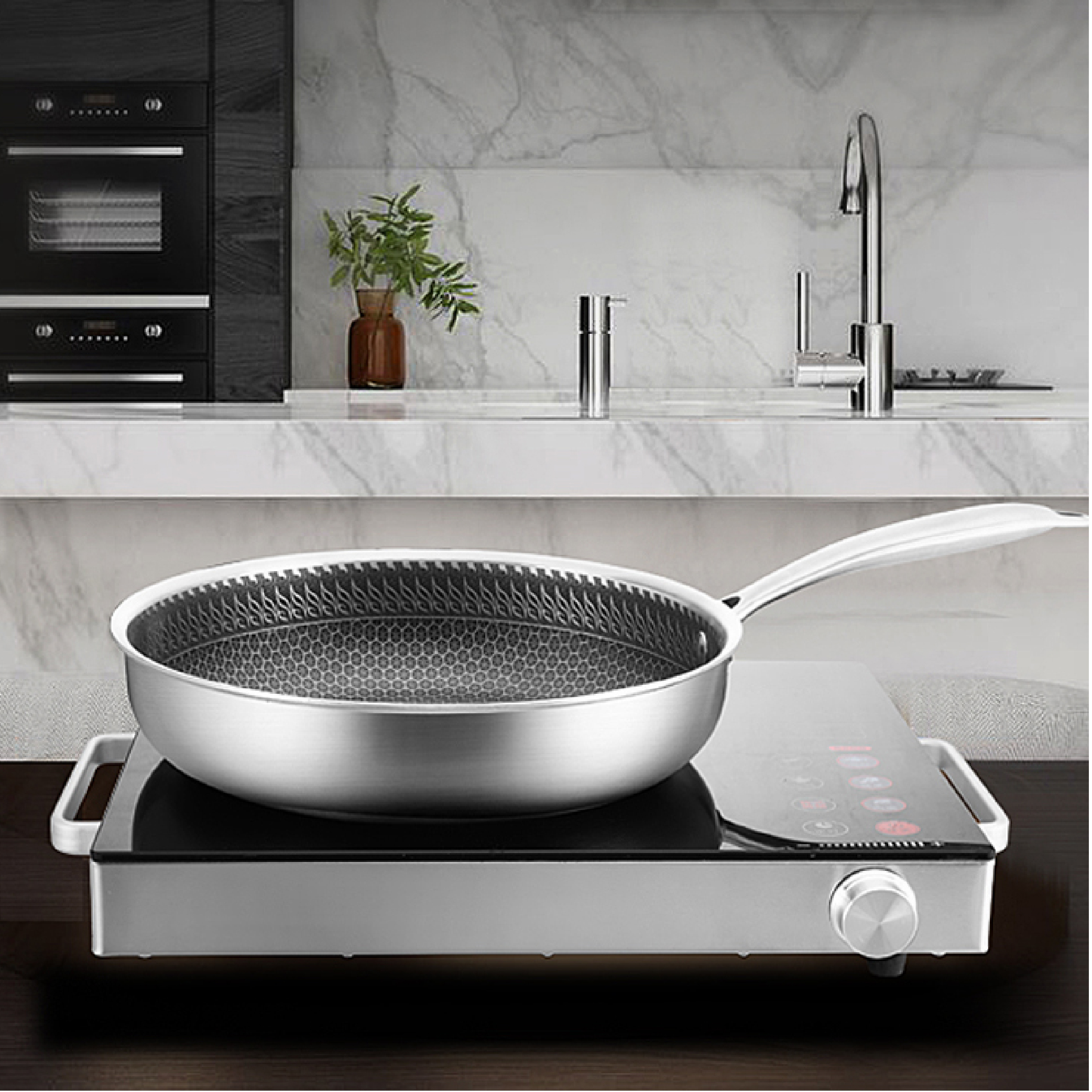 - Lòng chảo được phủ chống dính Honeycomb an toàn cho sức khỏe người dùng, chịu nhiệt lên tới 450 độ C
