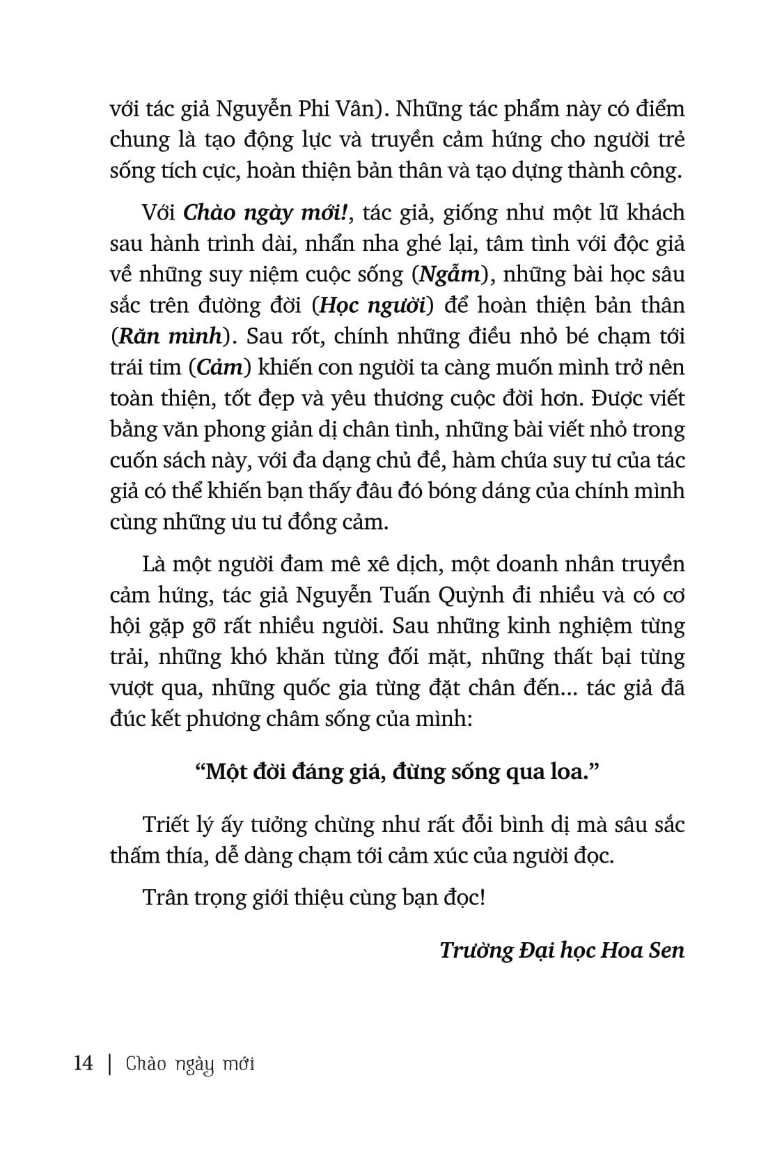 Với Chào ngày mới! tác giả, giống như một lữ khách sau hành trình dài, nhẩn nha ghé lại, tâm tình với độc giả về những suy niệm cuộc sống (Ngẫm), những bài học sâu sắc trên đường đời (Học người) để hoàn thiện bản thân (Răn m.ình). Sau rốt, chính những điều nhỏ bé chạm tới trái tim (Cảm) khiến con người ta càng muốn m.ình trở nên toàn thiện, tốt đẹp và yêu thương cuộc đời hơn. Được viết bằng văn phong giản dị chân tình, những bài viết nhỏ trong cuốn sách này, với đa dạng chủ đề, hàm chứa suy tư của tác giả có thể khiến bạn thấy đâu đó bóng dáng của chính m.ình cùng những ưu tư đồng cảm.