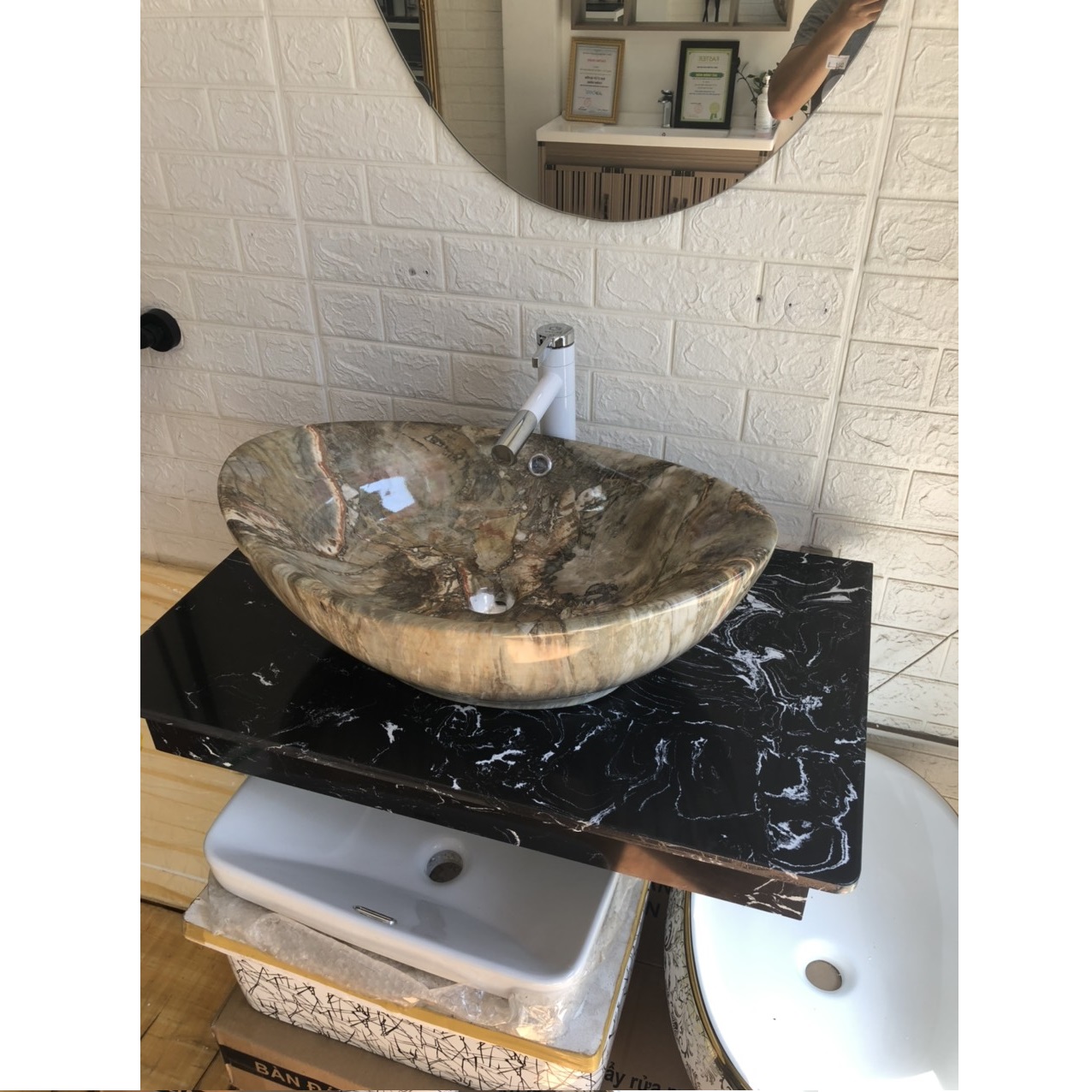 Combo lavabo chậu thuyền trắng + vòi trắng hoa vàng 30F + bàn đá vân mây chống xước cao cấp